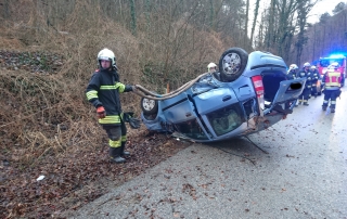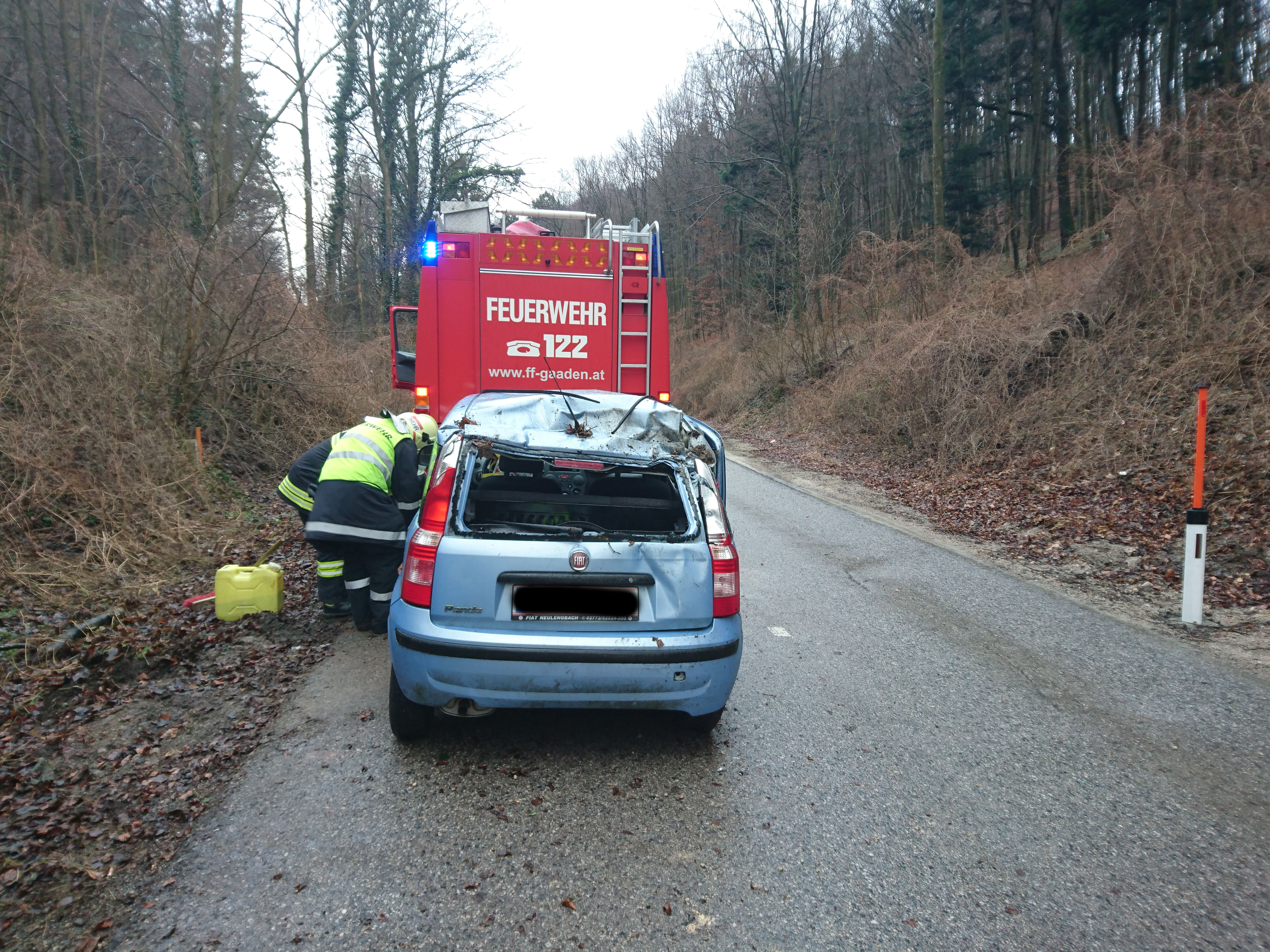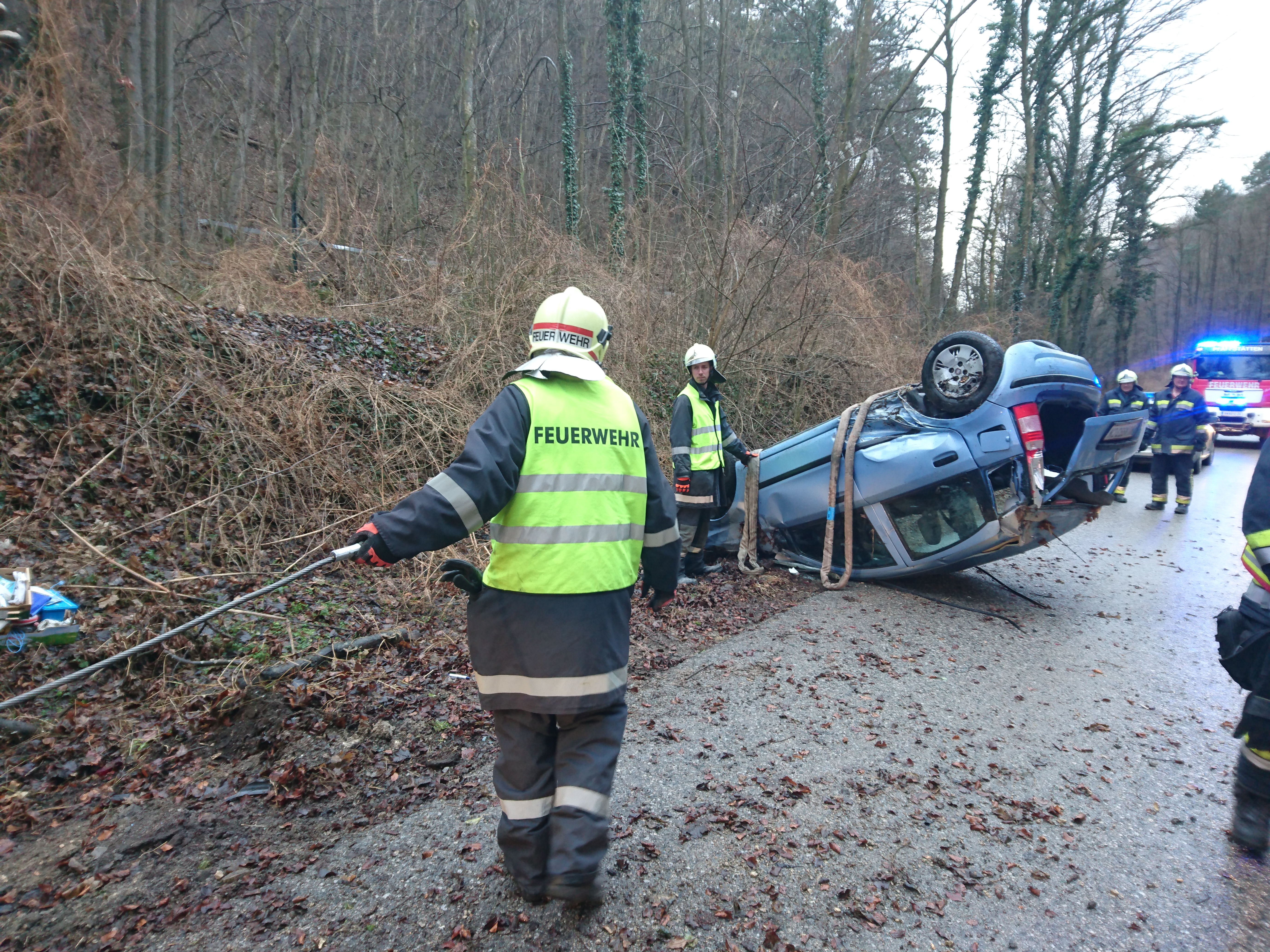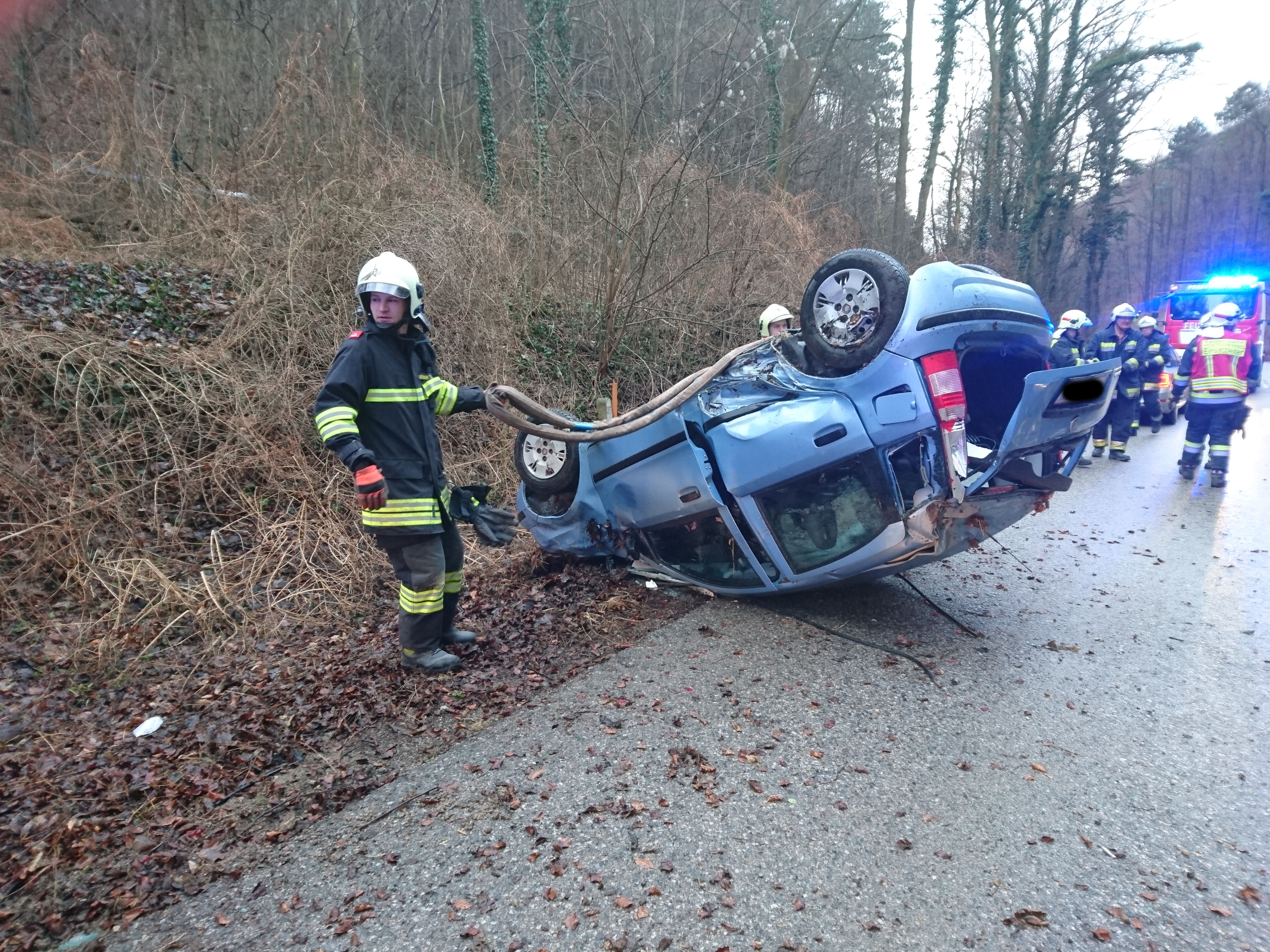 Der Lenker des Fiat verlor aus unbekannter Ursache die Kontrolle über sein Fahrzeug, welches sich überschlug und am Dach zu liegen kam. Er blieb bei diesem Unfall unverletzt.