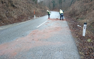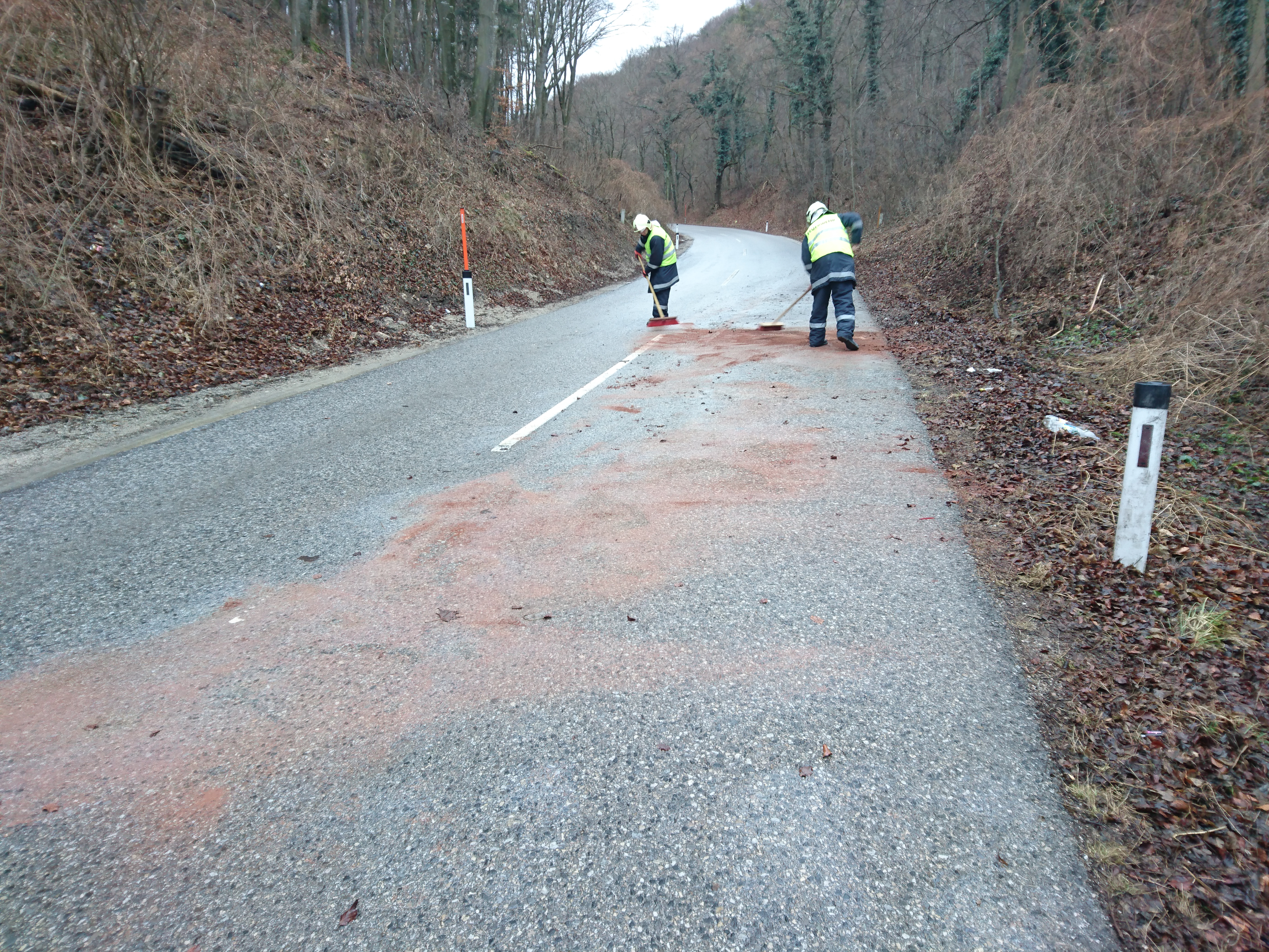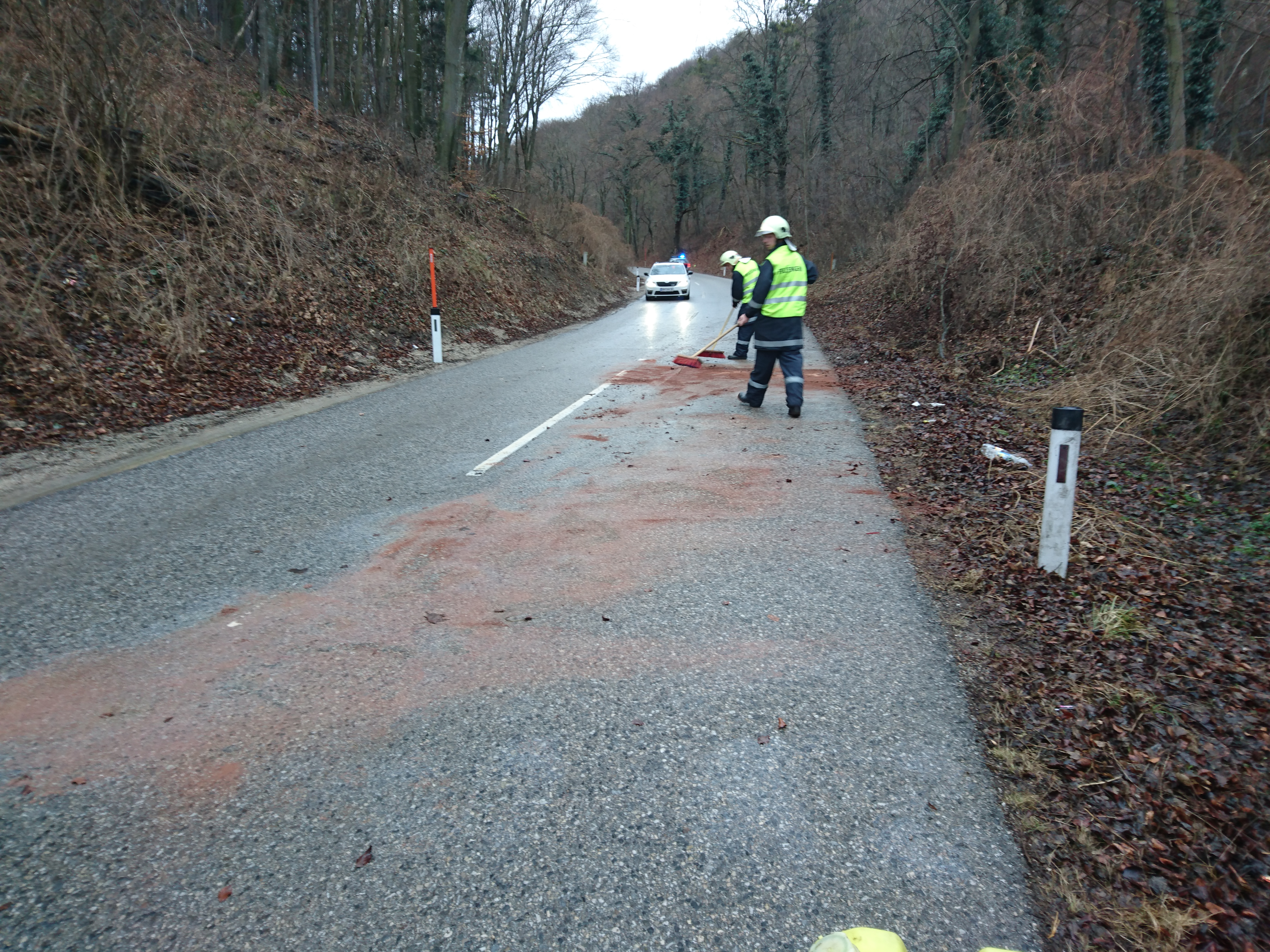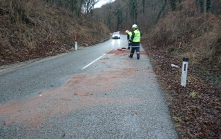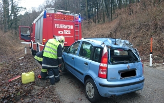 Unverzüglich stellten wir den Brandschutz mit einem Feuerlöscher her und brachten den PKW mittels Endlosschlinge und Seilwinde wieder auf die Räder. Anschließend schoben wir ihn auf die Abschleppbrille des RLF, stellten das Fahrzeug verkehrssicher ab und säurberten die Straße mit Ölbindemittel von ausgetretenen Betriebsmittel.