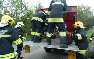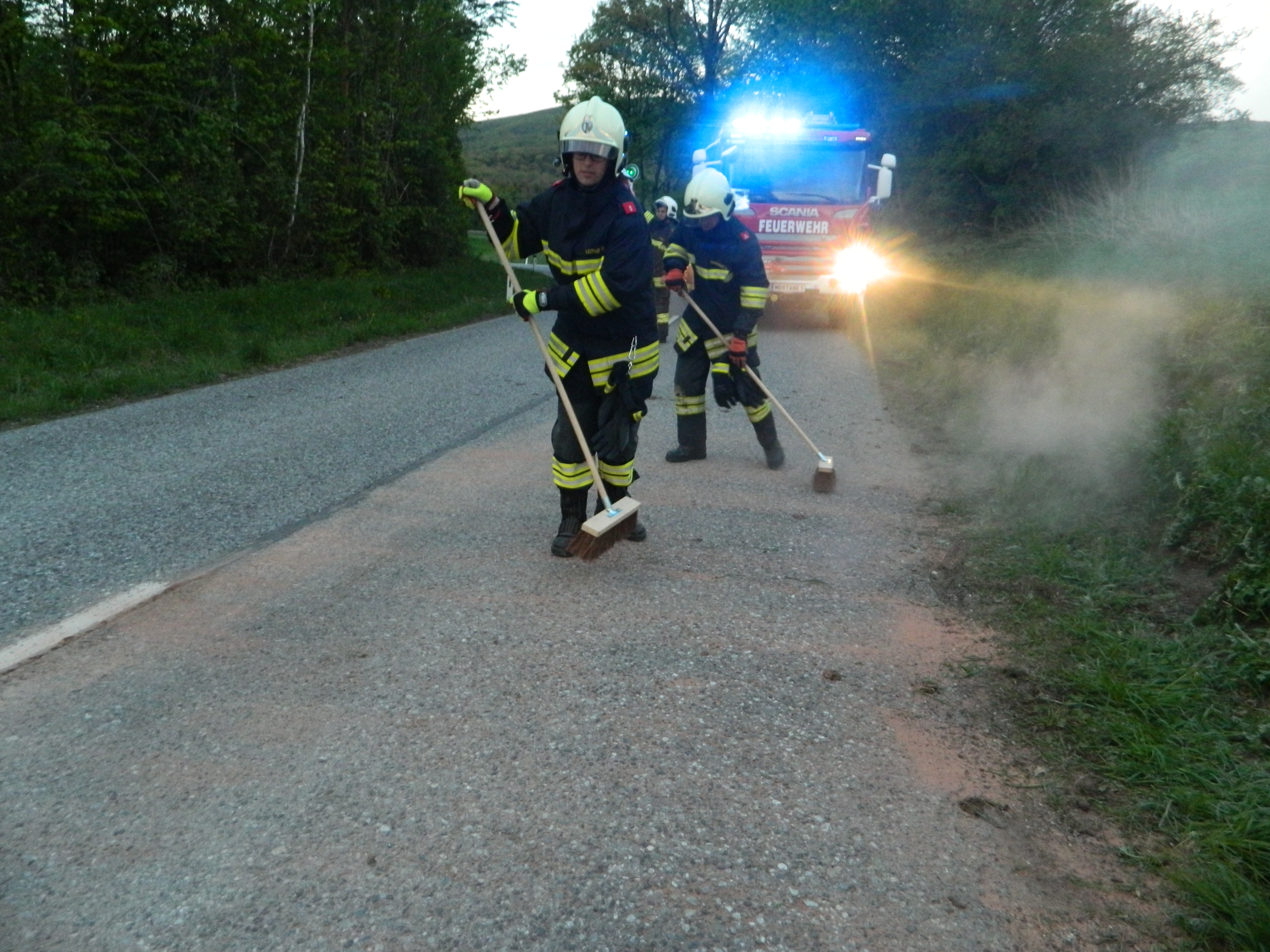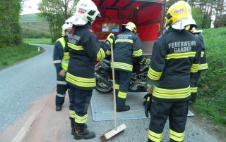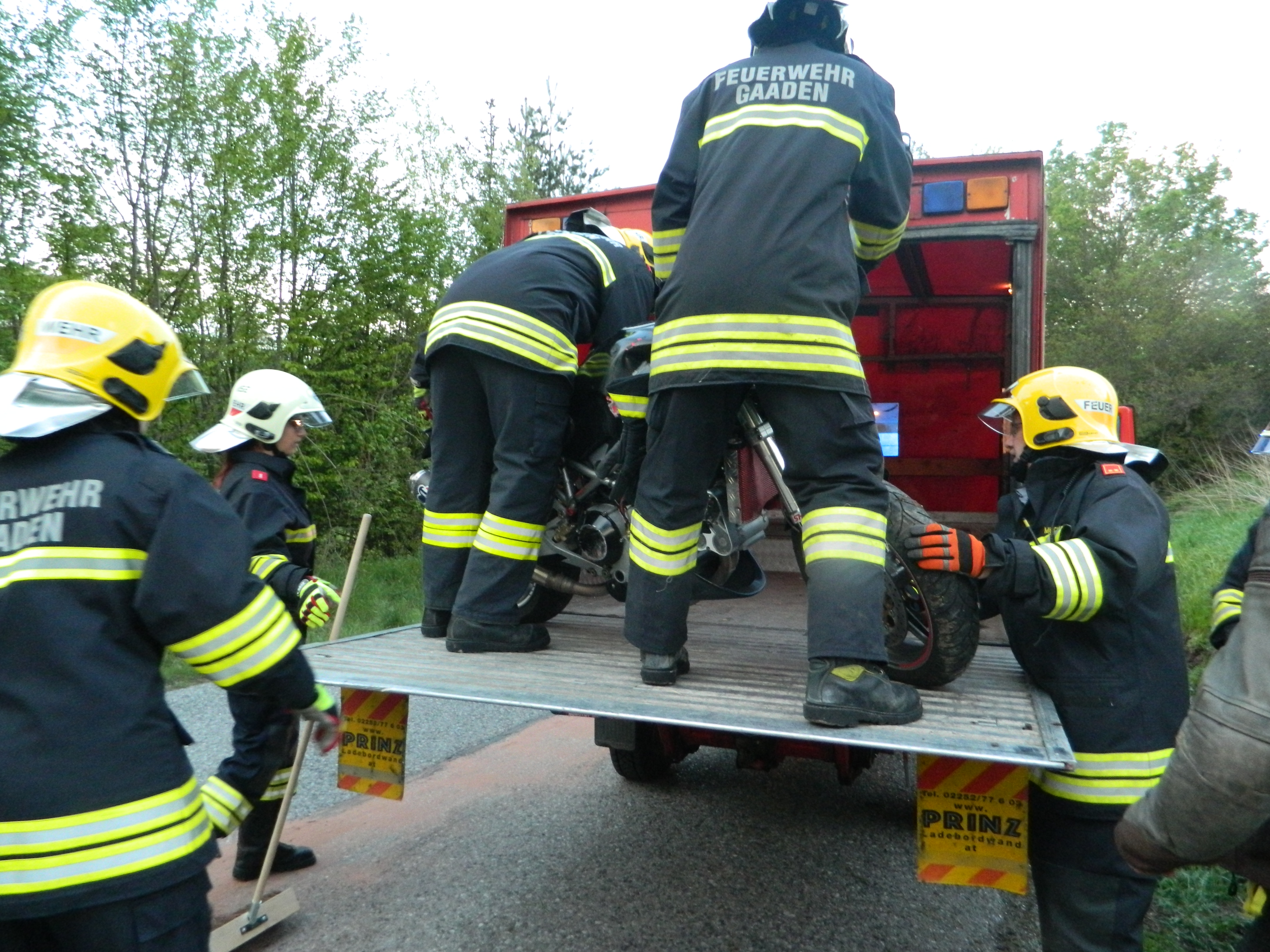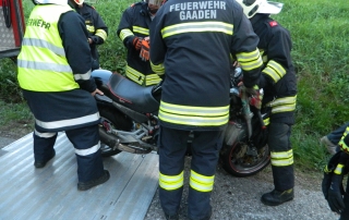 In einer Kurve verlor der Lenker eines Motorrads die Kontrolle über sein Fahrzeug und stürtzte. Bei unserer Ankunft lag das Motorrad bereits am Straßenrand und die Unfallstelle wurde durch engagierte Passanten mit einem Pannendreieck abgesichert. Wir stellten einen Brandschutz mit Feuerlöschern auf und sicherten den Verkehr. Ausgetretene Betriebsmittel wurden gebunden. Nachdem der nachalarmierte Last an der Einsatzstelle ankam, wurde das Motorrad verladen und verkehrssicher in Gaaden abgestellt.