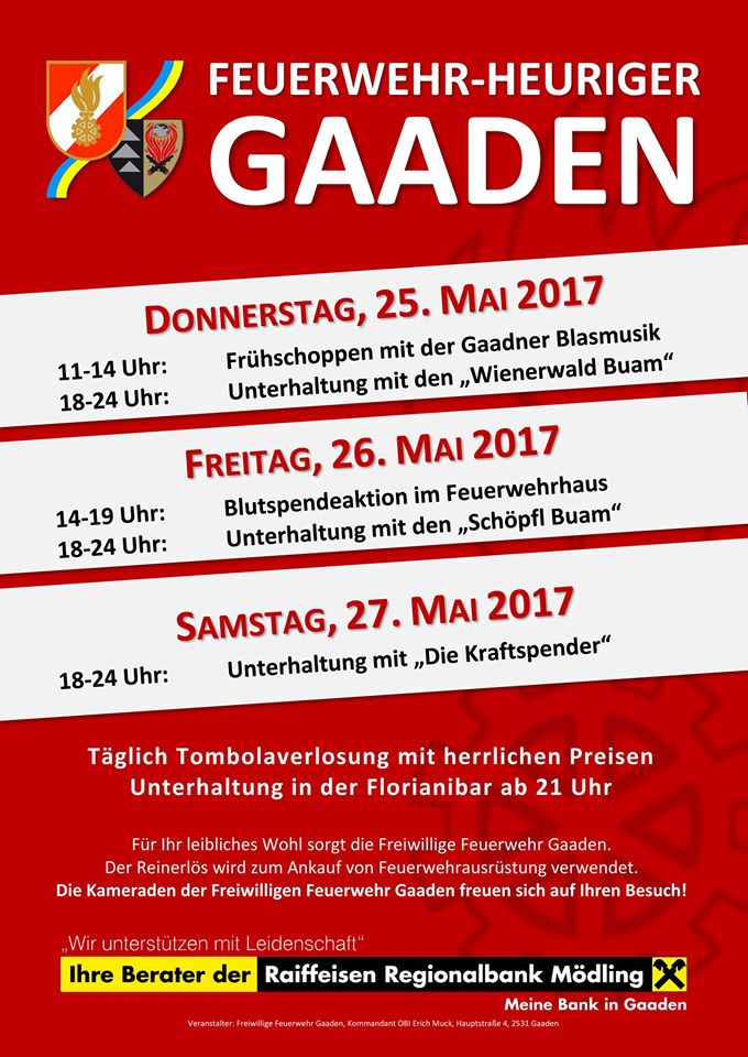 Wir möchten uns bei allen Sponsoren herzlich für die Unterstützung bedanken, aber vor allem bei Ihnen für Ihren Besuch beim Feuerwehr-Heurigen 2017 in Gaaden. Wir freuen uns jetzt schon sehr auf Ihren Besuch im nächsten Jahr.