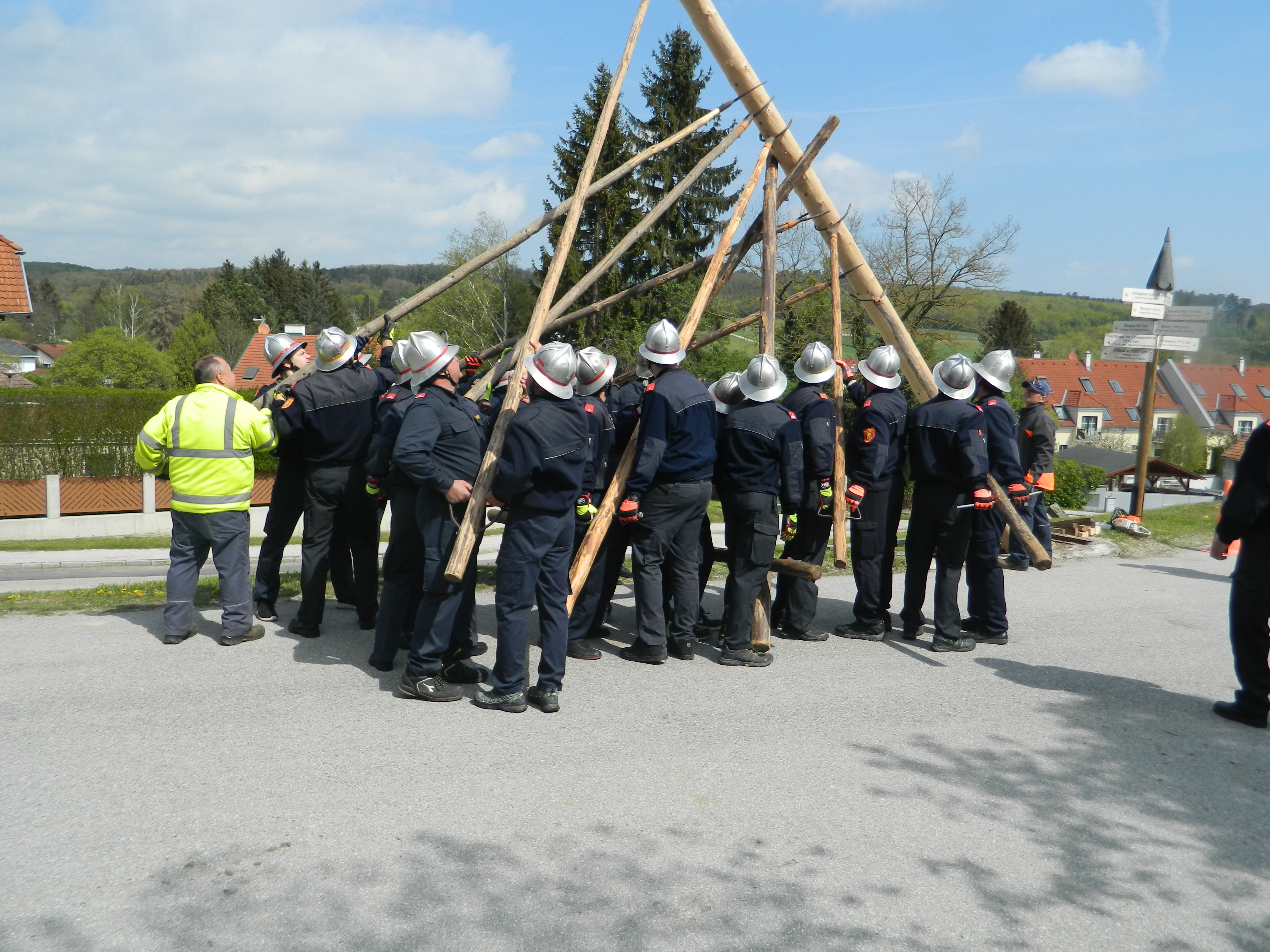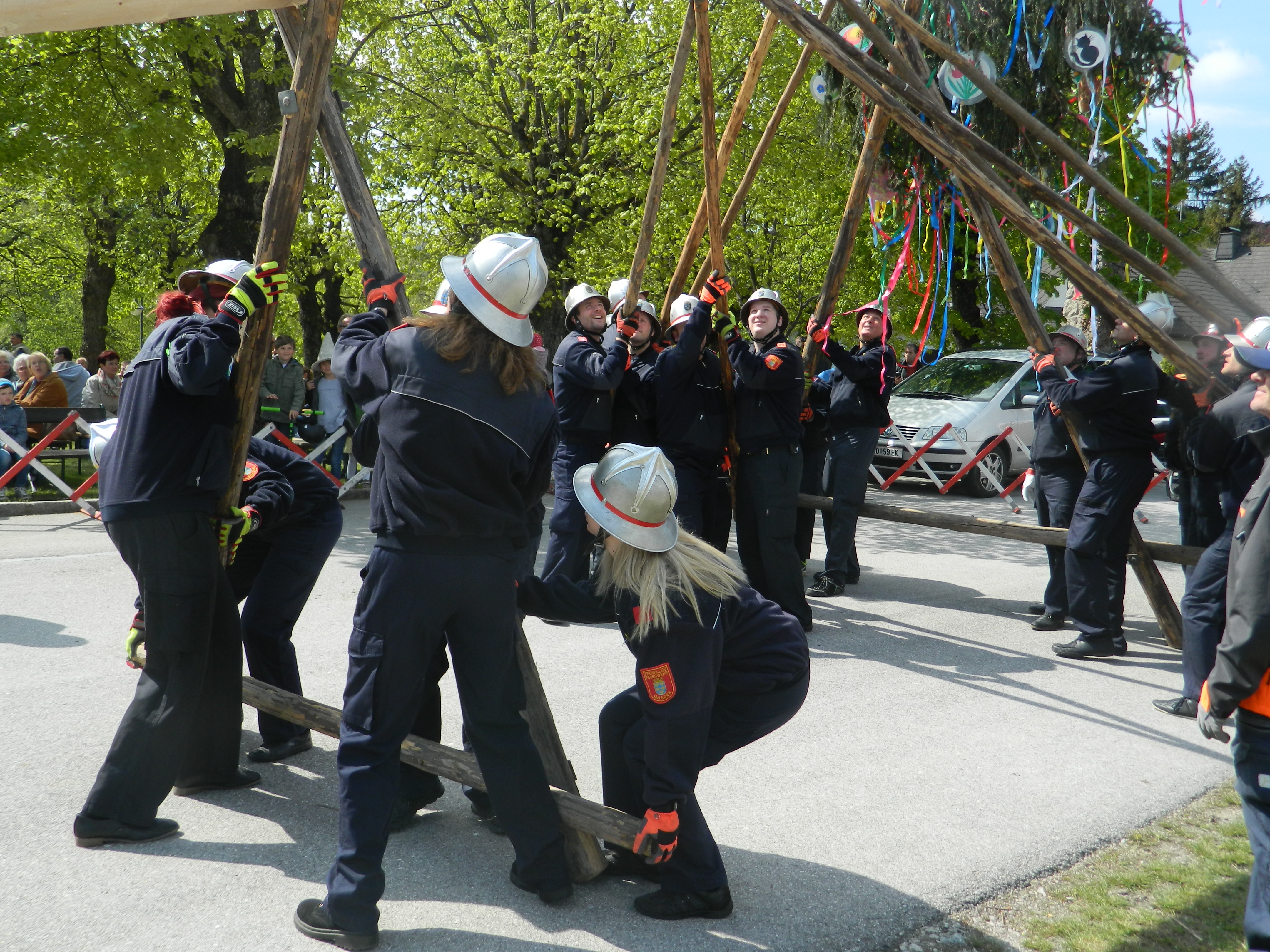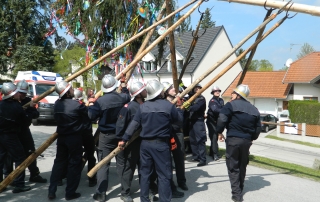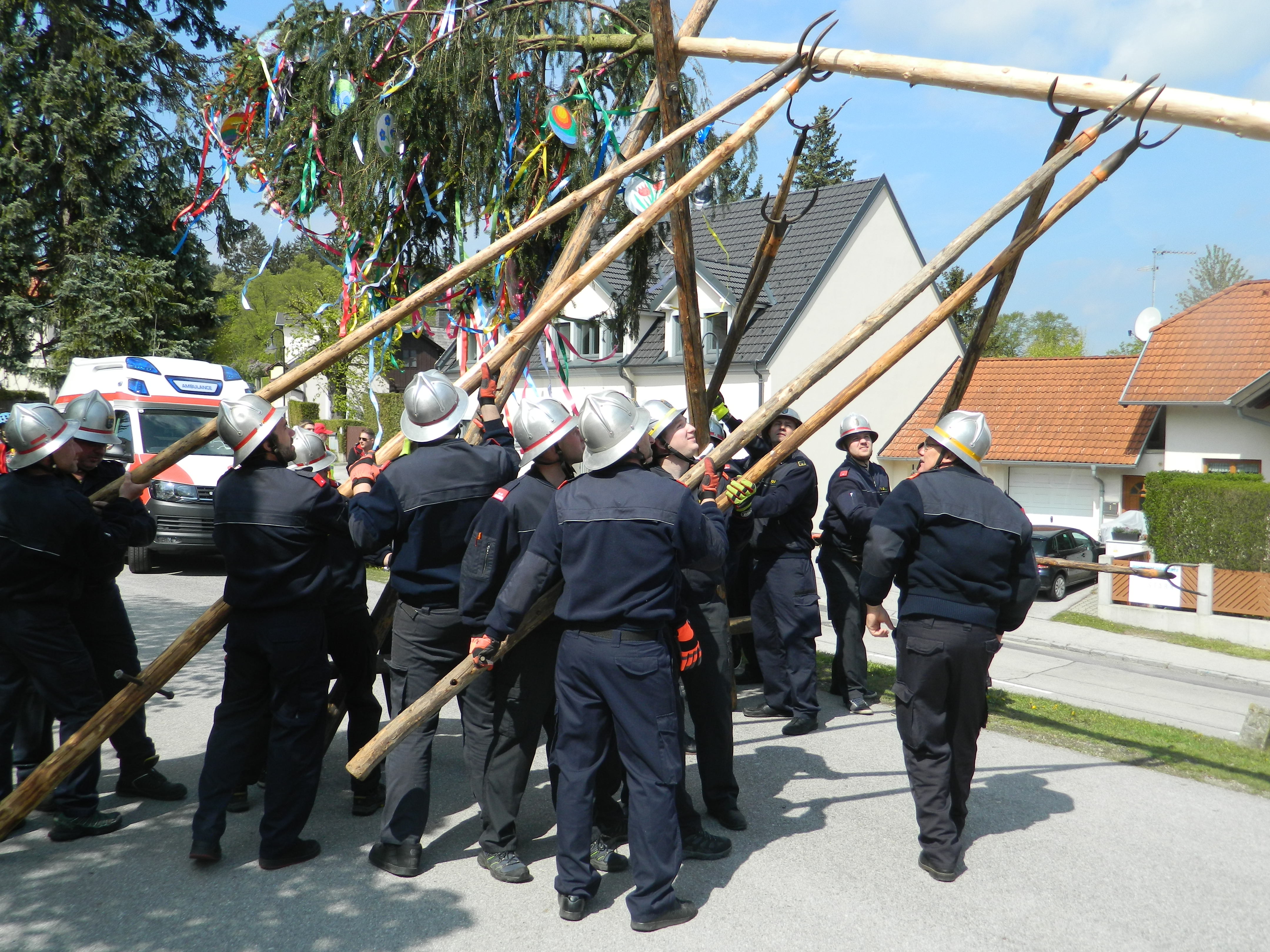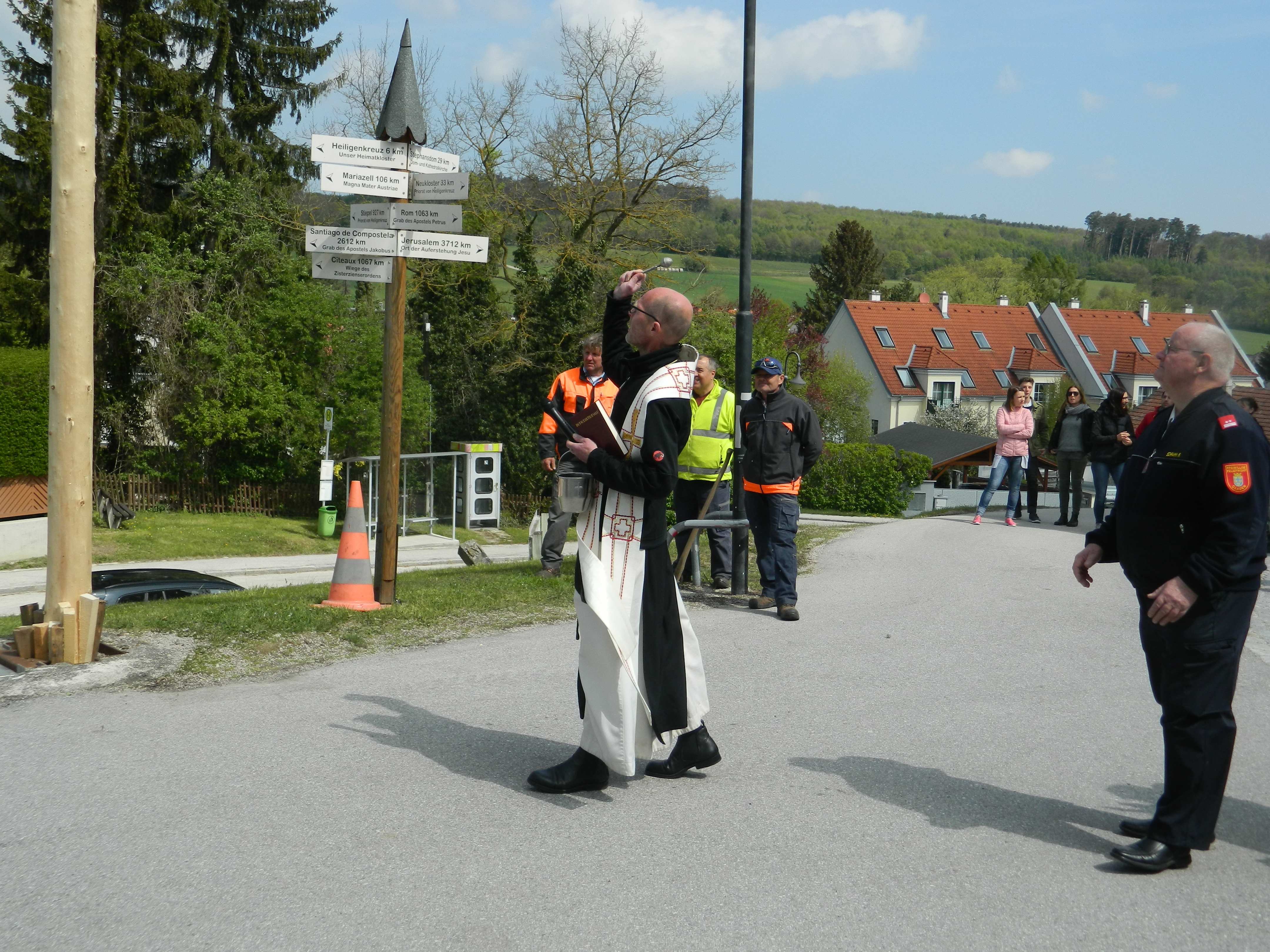 Anschließend wurde unter der Leitung von Kommandant OBI Erich Muck der Maibaum bei tollem Frühlingswetter von uns Mitgliedern händisch aufgestellt. Musikalisch unterstützt wurden wir von der Gaadner Blasmusik, welche sich in diesem Jahr auch um das leibliche Wohl der Gäste kümmerte. Danach wurde der Baum von Feuerwehrkurat Pater Kosmas gesegnet.