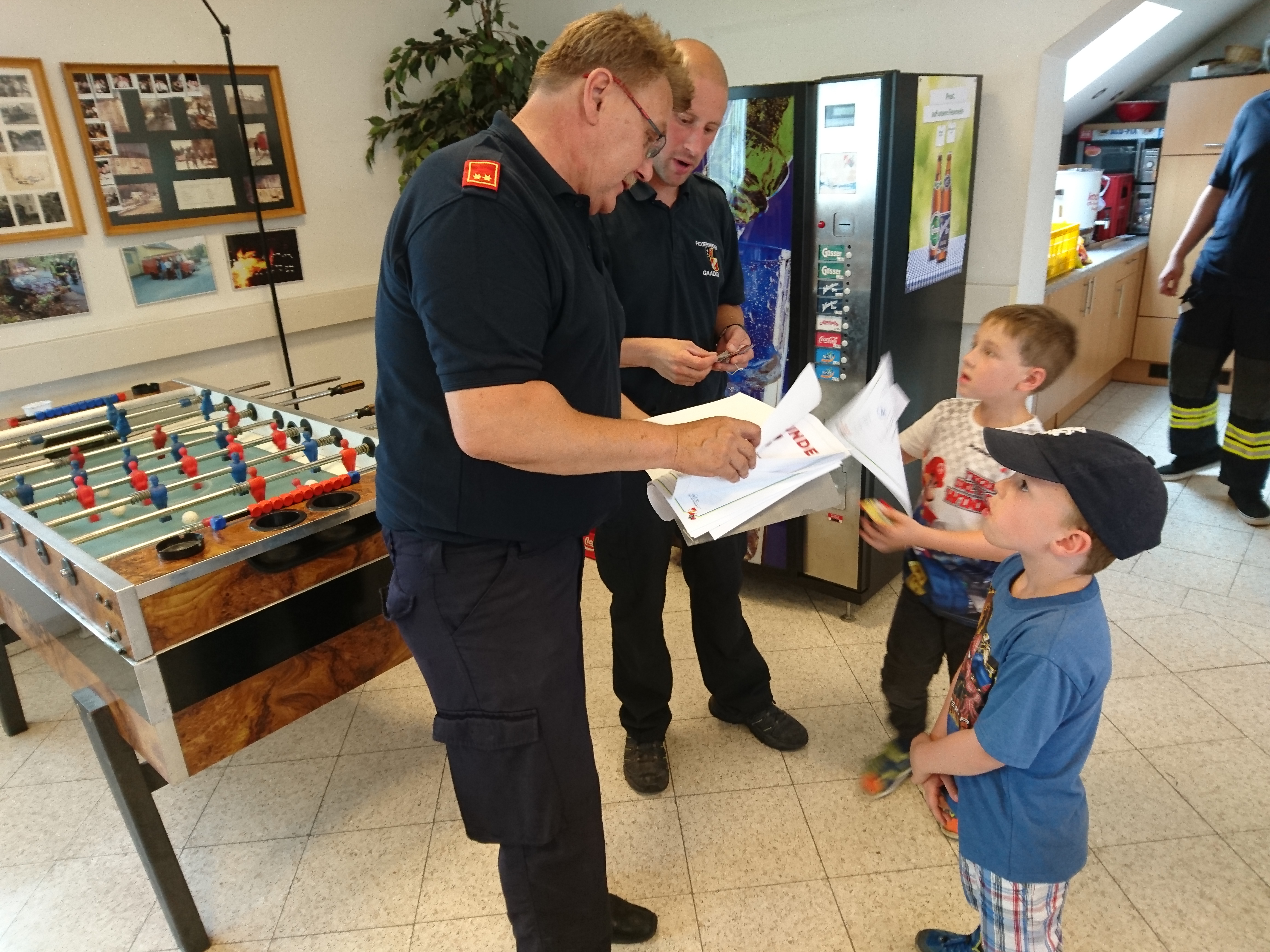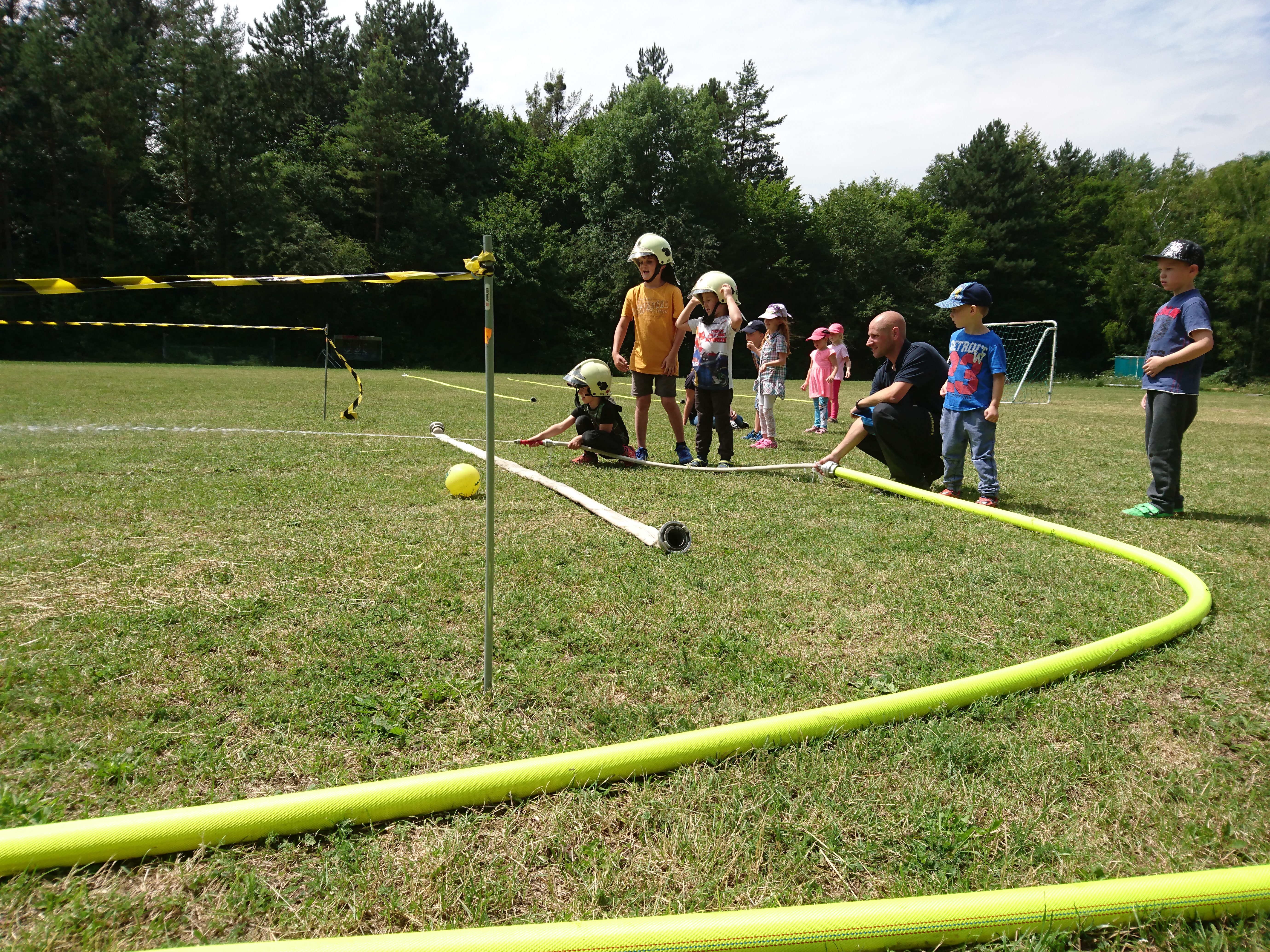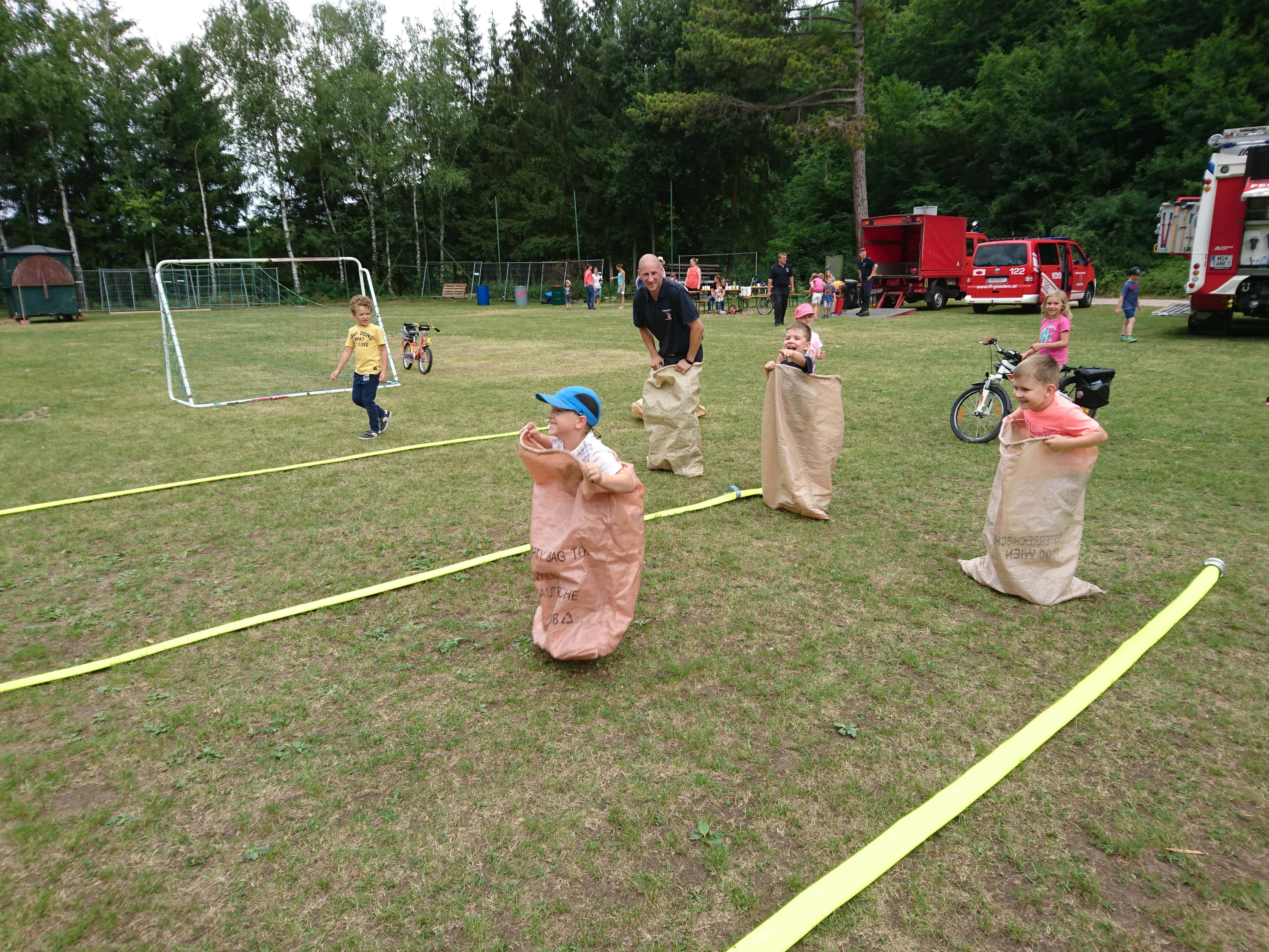 Knapp 20 Kinder waren unserer Einladung zum Kinderferienspiel gefolgt, um einen Nachmittag mit der Feuerwehr zu verbringen. Hierbei musste jeder in verschiedenen Stationen seine Schnelligkeit, Geschick sowie Ausdauer unter Beweis stellen. Am Sportplatz konnten die Kinder nicht nur das Feuerwehrauto bestaunen und das Inventar ausprobieren, sondern auch Zielspritzen und Sackhüpfen. Nachdem es nach kurzer Zeit zu regnen begann, wurde der Veranstaltungsort kurzerhand ins Feuerwehrhaus verlegt. Dort ging es mit Malen & Zeichnen, Tischfußball spielen und Würstel essen weiter. Am Ende wurden noch Erinnerungsurkunden, ein Dienstausweis für den „geprüften Jungfeuerwehrmann“ sowie eine kleine Überraschung überreicht. Sechs Mitglieder der Feuerwehr Gaaden waren fünf Stunden im Einsatz.
