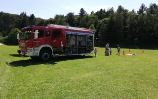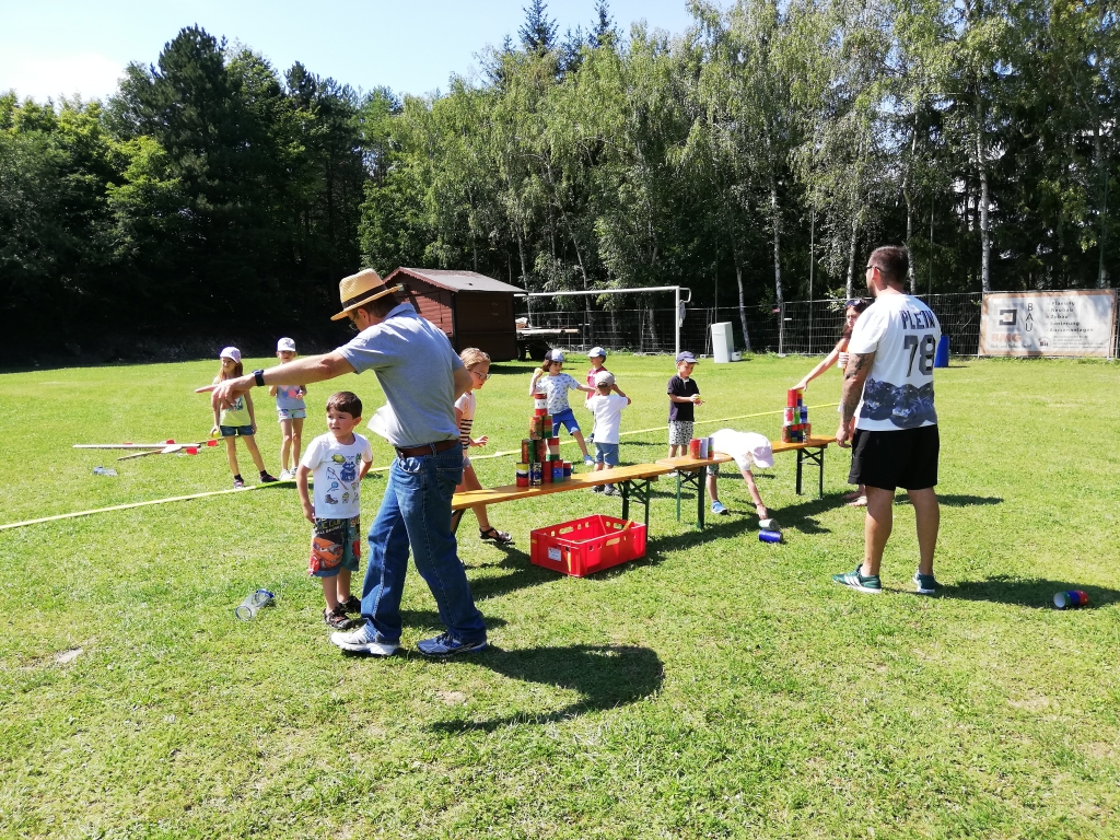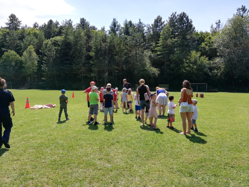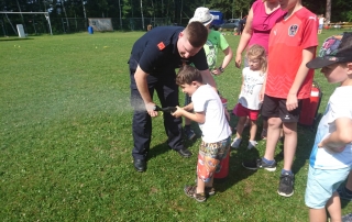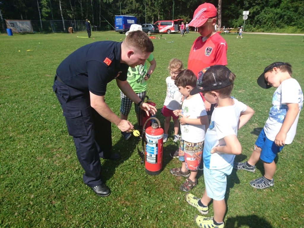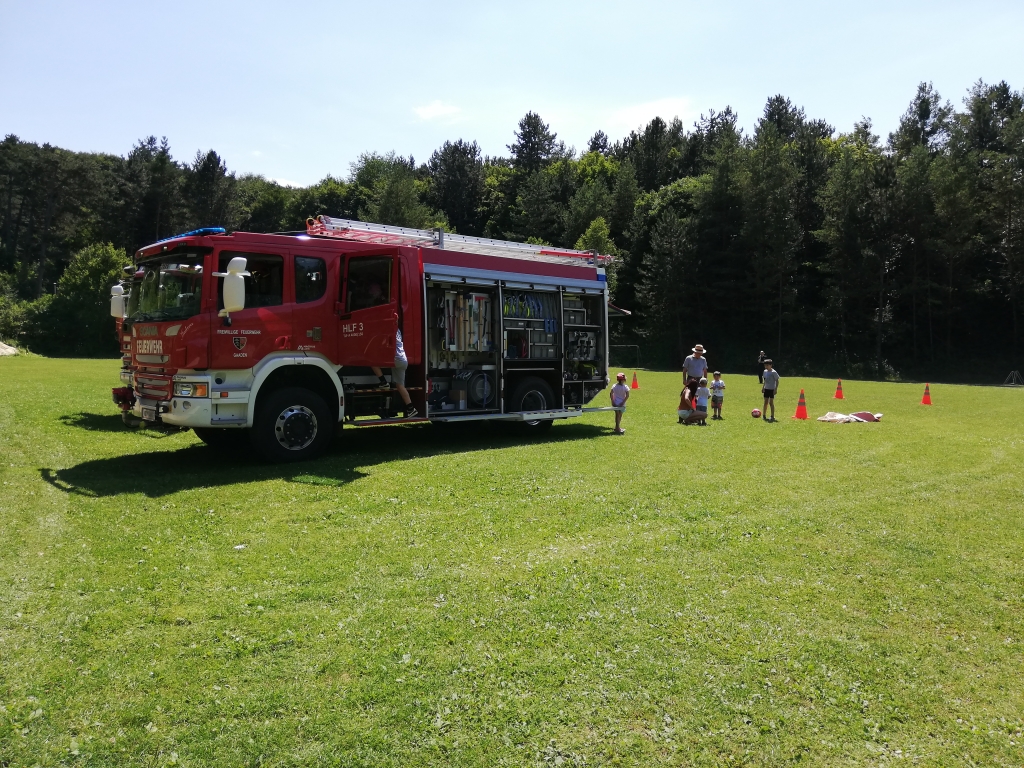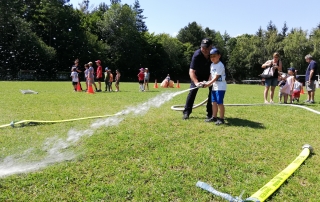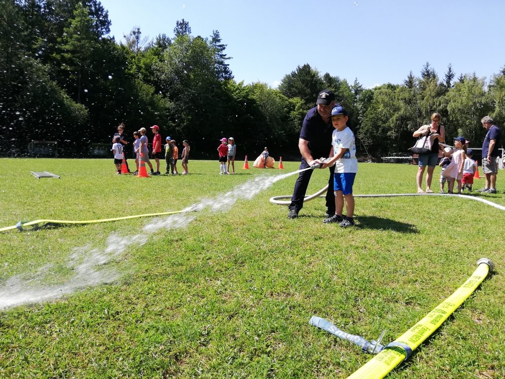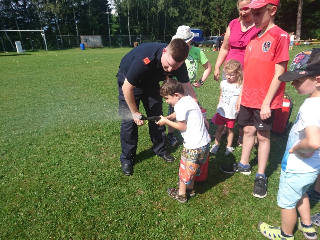 Knapp 40 Kinder waren unserer Einladung zum Kinderferienspiel am Sportplatz gefolgt, um einen Nachmittag mit der Feuerwehr zu verbringen. Bei verschiedenen Stationen konnte die Kinder Schnelligkeit sowie Geschick unter Beweis stellen. Hierbei mussten sie unter anderem einen Fußball mittels Strahlrohr in ein Tor „hineinlöschen“ oder einen Hindernisparcour bewältigen. Ebenso waren die Möglichkeiten für Sackhüpfen, Stelzengehen oder Malen und Zeichnen geboten. Das Highlight war aber sichtlich die Fahrt mit den großen Feuerwehrautos, die alle Kinderaugen strahlen ließen. Im Anschluss gab es noch eine kleine Unterrichtseinheit über das Verhalten im Brandfall und den richtigen Umgang mit Handfeuerlöschern, bevor nach einer Stärkung mit Würstelessen und der Übergabe einer Erinnerungsurkunde ein schöner und lustiger Nachmittag zu Ende ging.
