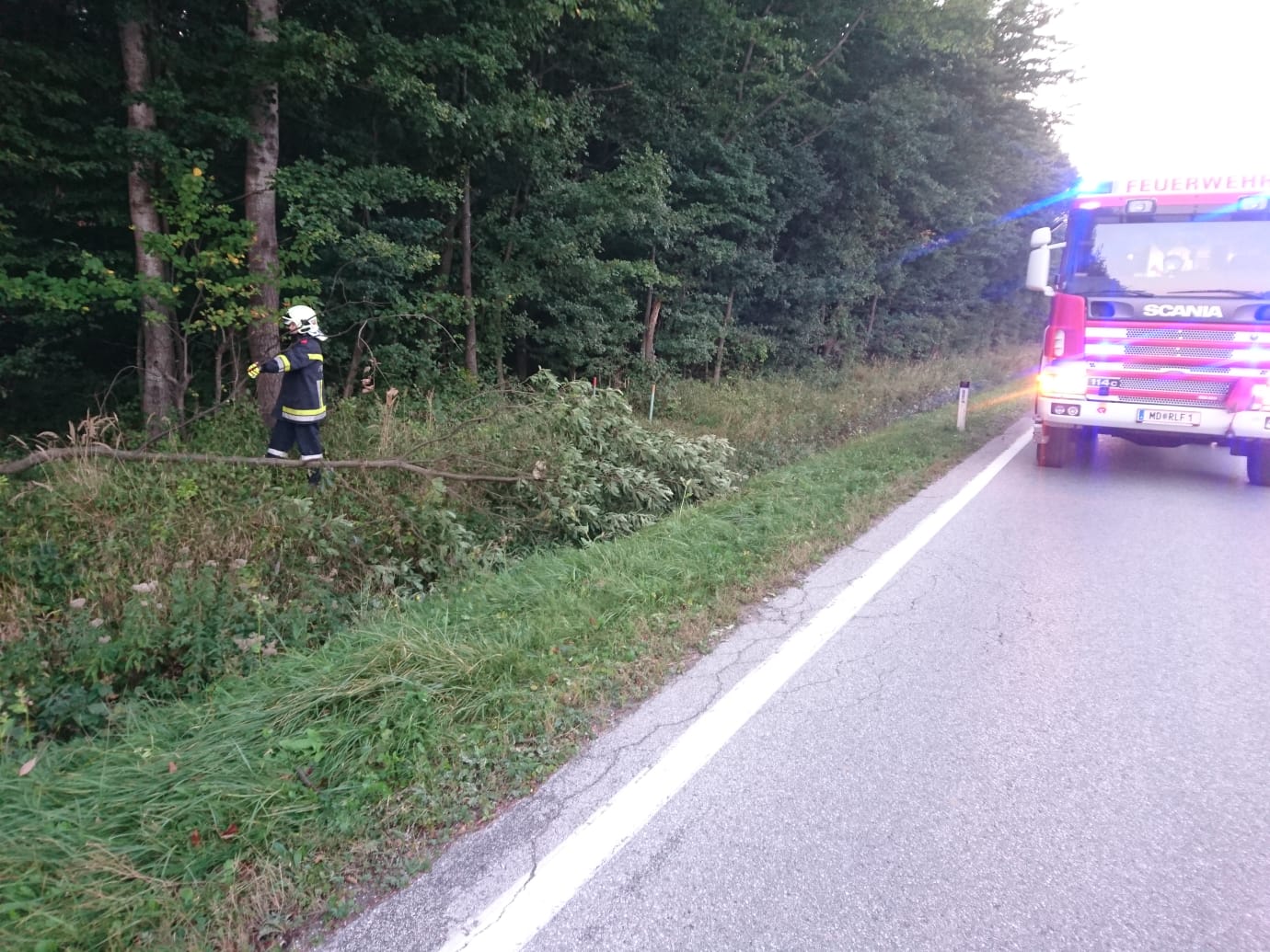 Heute wurden wir um 18:40 Uhr zu einer technischen Hilfeleistung alarmiert. Ein Anzeiger gab bei der Bezirksalarmzentrale bekannt, dass ein Baum über die Bundesstraße hängt und somit eine Fahrspur blockiert. Unverzüglich rückten wir mit sechs Mann und unserem Rüstlöschfahrzeug zum besagten Einsatzort aus, wo wir zwar einen umgeknickten Ast vorfanden, der jedoch nicht auf die Fahrbahn ragte und somit auch in keiner Weise ein Verkehrshindernis darstellte. Nach Rücksprache mit der Bezirksalarmzentrale dürfte es sich trotzdem um den alarmierten „Baum über Straße“ handeln, weshalb wir den Ast vorsorglich abschnitten und noch weiter weg vom Fahrbahnrand ablegten. Nach zwanzig Minuten konnten wir den Einsatz beenden und wieder einrücken.