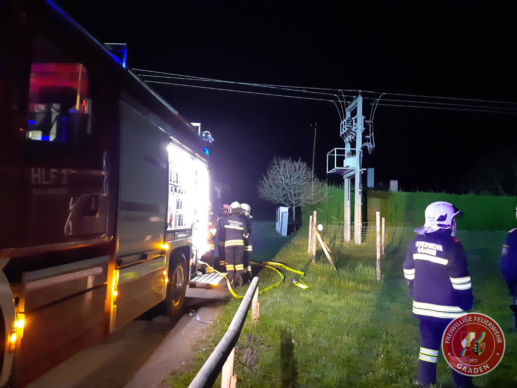 Kurz vor Mitternacht wurden wir zu einem Trafobrand in die Feldgasse alarmiert. Unverzüglich rückten wir mit zwei Löschfahrzeugen zur Einsatzstelle aus, wo wir einen abklingenden Brand eines Freileitungs-Trafos vorfanden. Die Vornahme eines Löschangriffs war nicht mehr notwendig, somit wurde ein Brandschutz aufgebaut und die Bereitschaft des Stromversorgungsunternehmen angefordert.