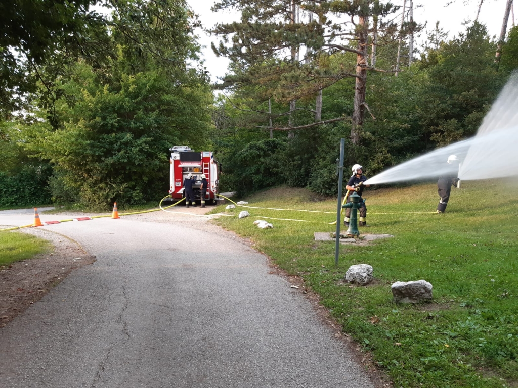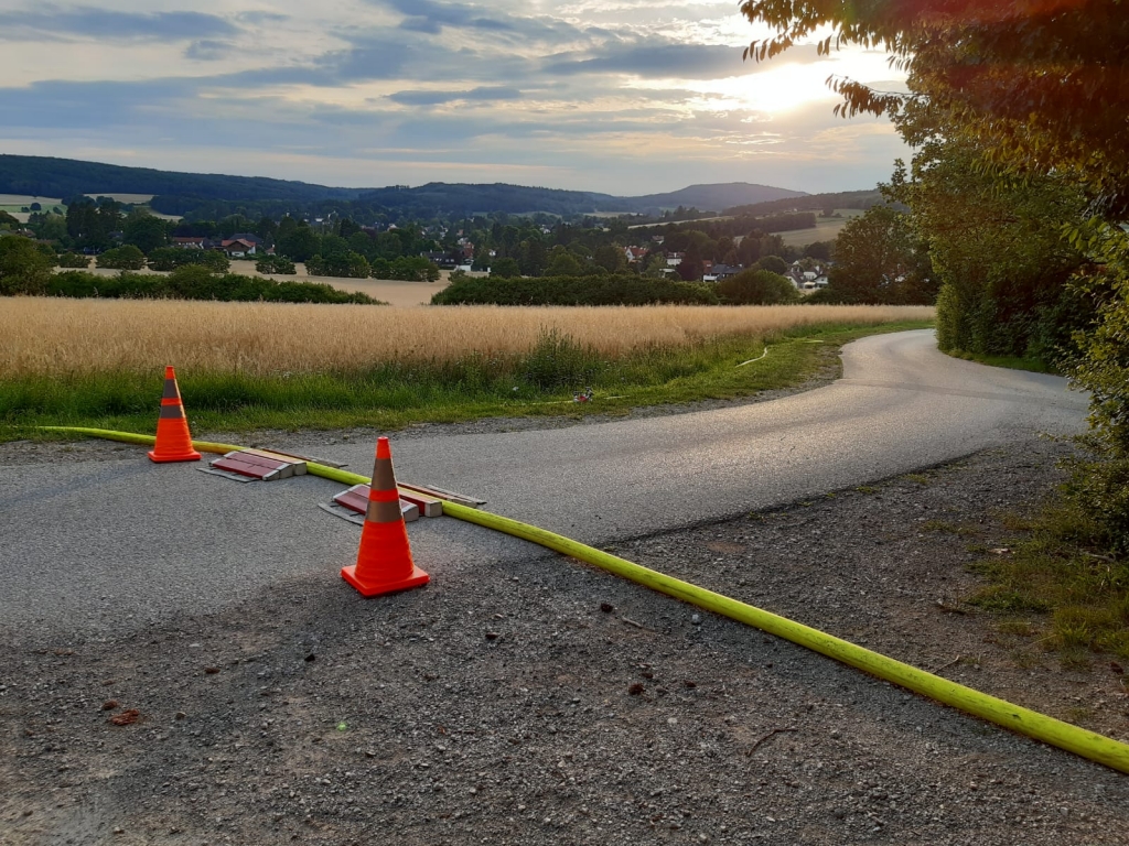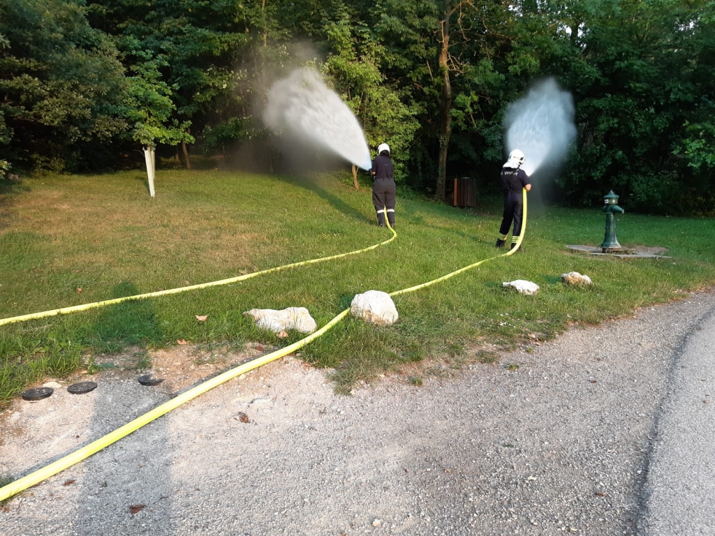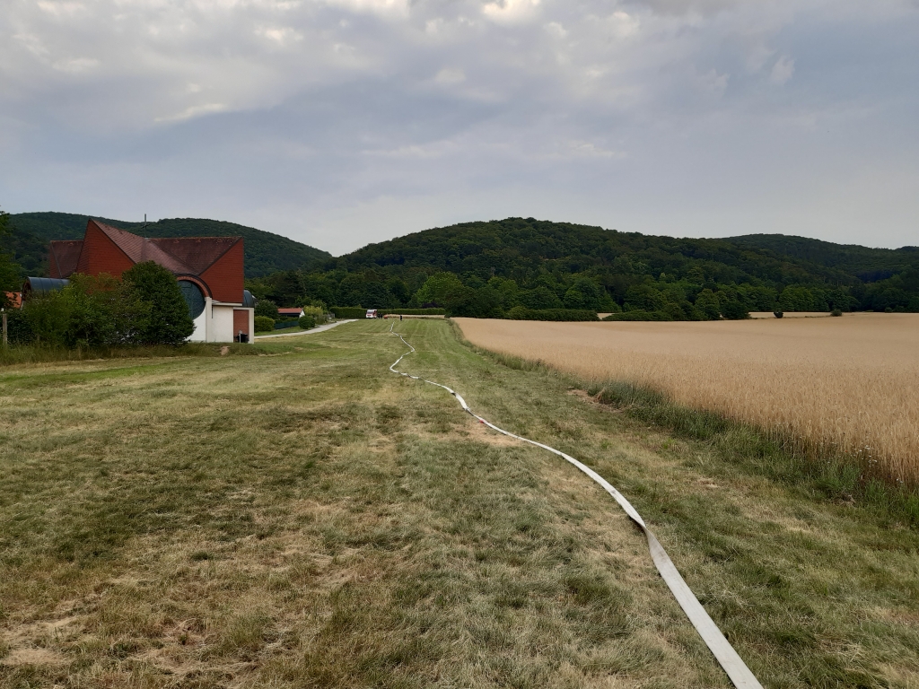 Im Anschluss wurden die festgelegten Standplätze mit den Löschfahrzeugen bezogen und die Zubringleitung aufgebaut. Nachdem die Wasserversorgung hergestellt war, wurde der Löschangriff mit verschiedenhohem Wasserverbrauch mit bis zu 1.000 Liter pro Minute getestet, um sicherzustellen, dass auch im Einsatzfall genügend Löschwasser zum angenommen Objekt gefördert werden kann.
