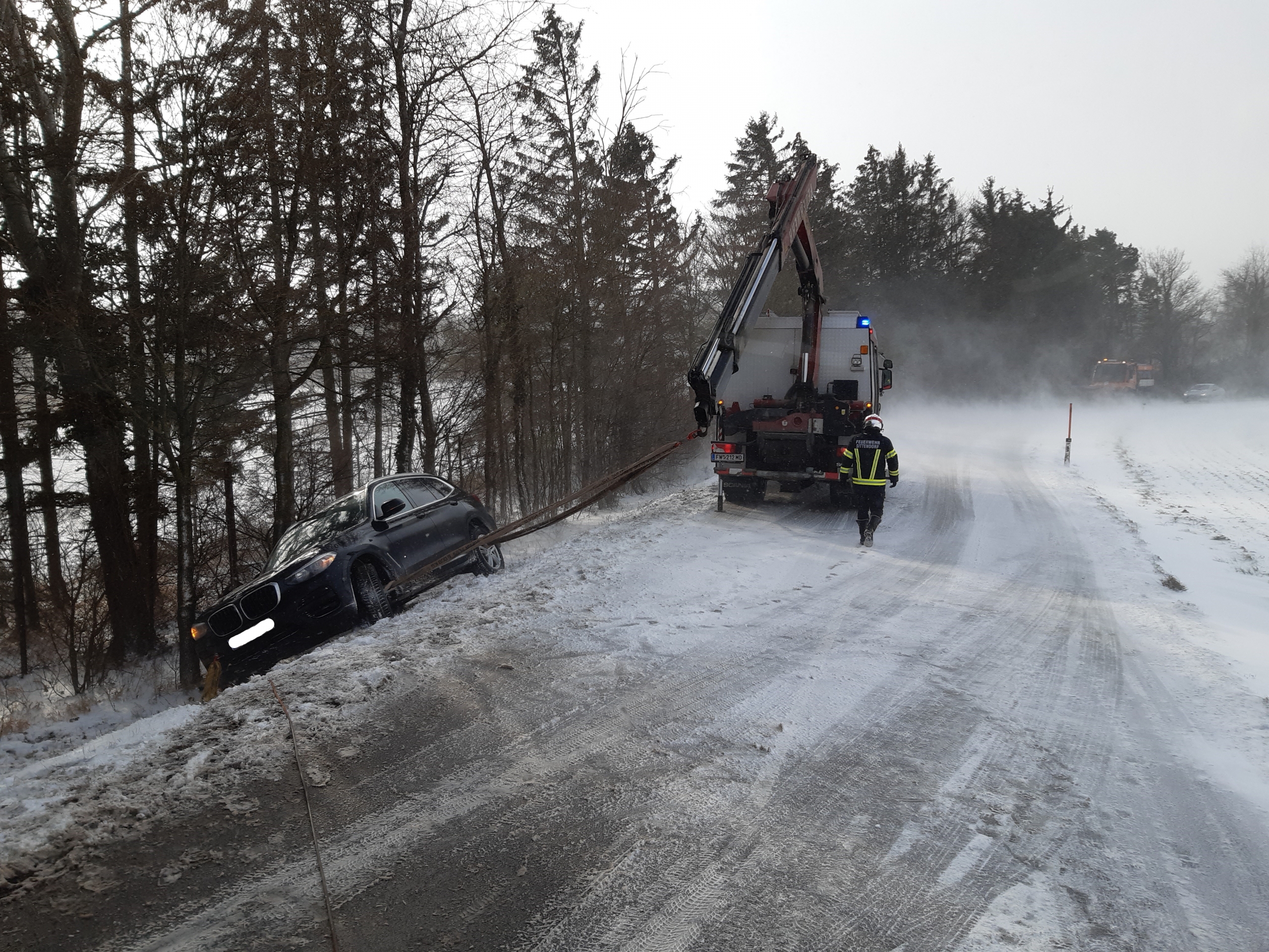 Bei unserer Erkundung stellten wir fest, dass das Unfallauto glücklicherweise unbeschädigt neben einigen Bäumen stand. Da bei einer Bergung mittels Seilwinde die Gefahr des Abrutschens und einer damit verbundenen Beschädigung bestand, entschieden wir uns zur Nachalarmierung des schweren Rüstfahrzeuges mit Kran der Freiwilligen Feuerwehr Sittendorf. In Zusammenarbeit mit unseren Kameraden der Nachbarwehr konnten wir das Auto mittels Kran und unserer Seilwinde schonend bergen, woraufhin die Lenkerin die Fahrt selbstständig fortsetzen konnte.