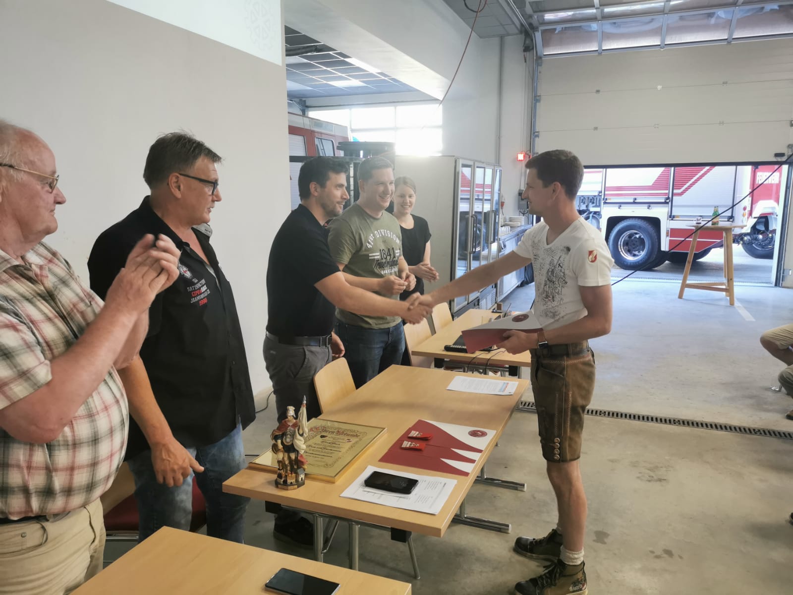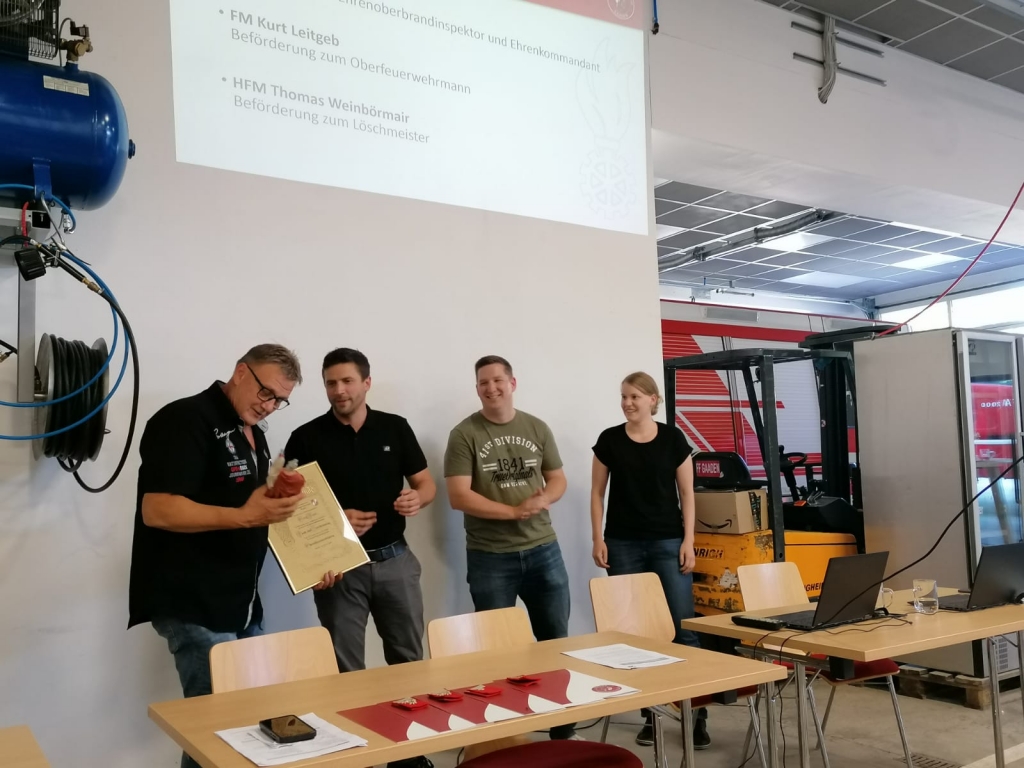 Anschließend folgten die Beförderungen von FM Kurt Leitgeb zum Oberfeuerwehrmann, HFM Thomas Weinbörmair zum Löschmeister und die Ernennung von BM Werner Stembier zum Ehrenbrandmeister. Erich Muck wurde zum Ehrenkommandant ernannt und der Dienstgrad Ehrenoberbrandinspektor verliehen. Das Kommando sowie die gesamte Mannschaft bedankte sich für seine besonderen Leistungen in den vergangenen Jahren und überreichten eine Ehrenurkunde sowie eine Florianstatue. Die Beförderungen von OBM Michael Niedermayer zum Hauptbrandmeister sowie BM Fritz Matzenauer zum Oberbrandmeister werden aufgrund deren Abwesenheit nachgereicht.