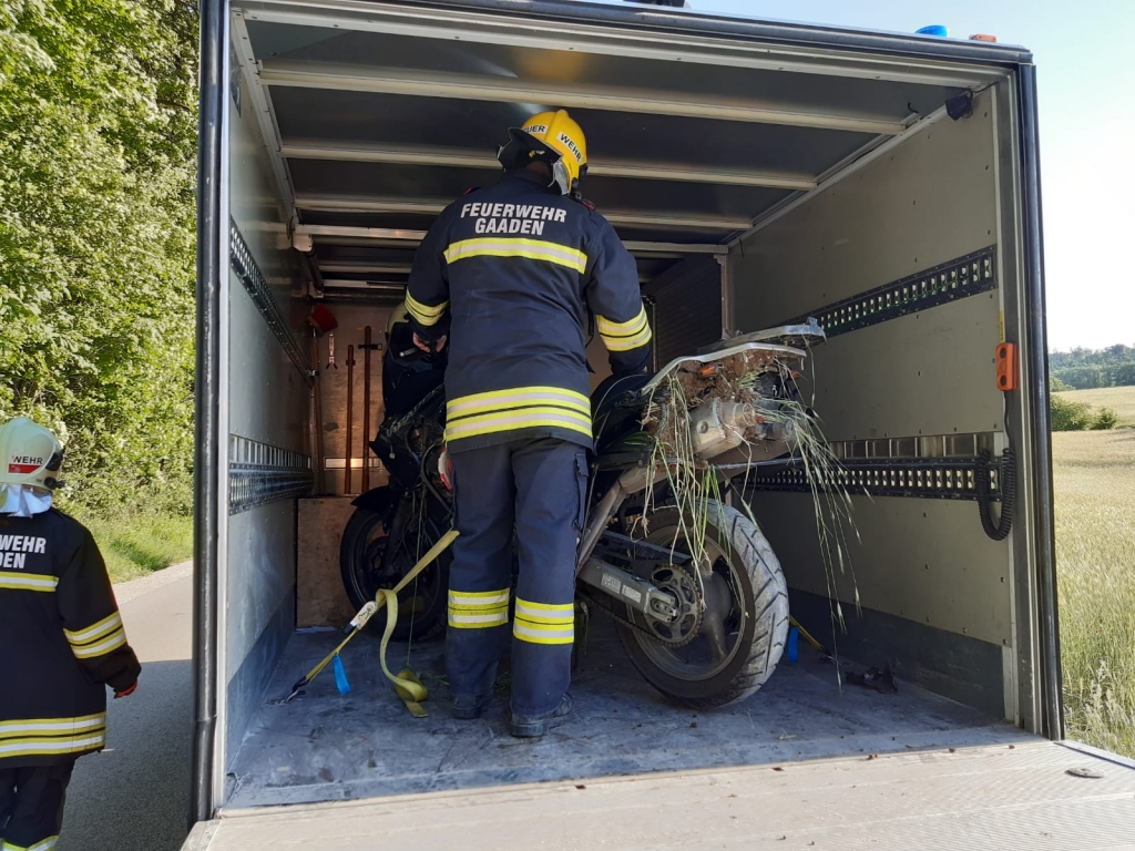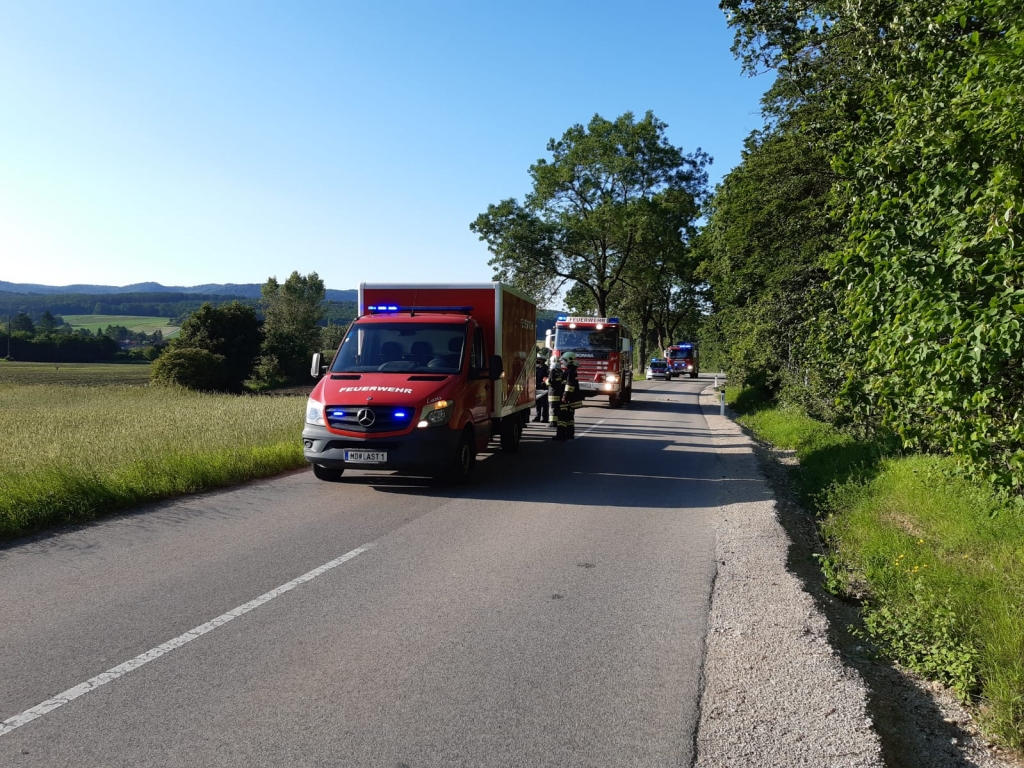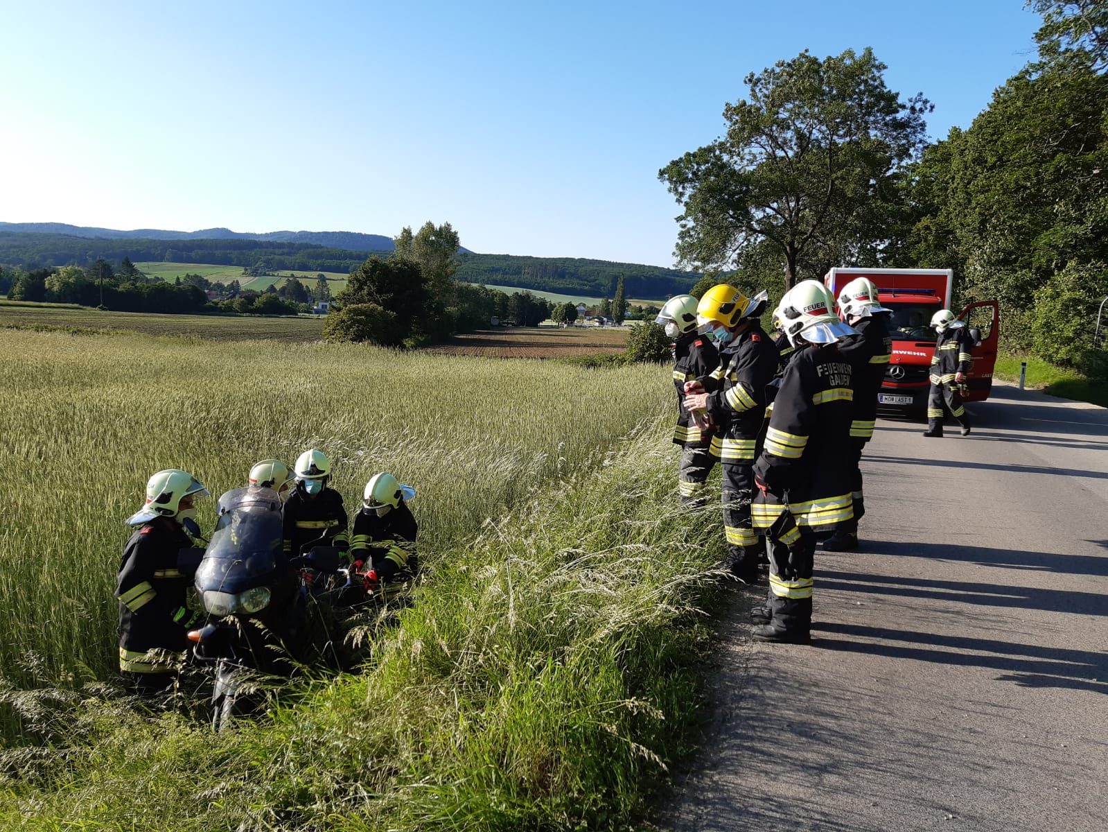 Am 13. Juni 2021 kam ein Motorradlenker auf der L4010 von der Fahrbahn ab und stürzte in ein angrenzendes Feld. Da sich dieser dabei Verletzungen am Arm zuzog, wurde durch einen vorbeifahrenden Ersthelfer die Rettungskette in Gang gesetzt. Bei unserer Ankunft um etwa 18:35 Uhr wurde der Lenker bereits vom Rettungsdienst versorgt. Unsere Aufgabe bestand darin, das verunfallte Motorrad zu bergen. Wir schoben das Fahrzeug zurück auf die Straße, verluden es in unseren Last und stellten es anschließend auf dem Parkplatz bei der Ortseinfahrt ab. 15 Kameraden waren mit drei Autos eine halbe Stunde lang im Einsatz.