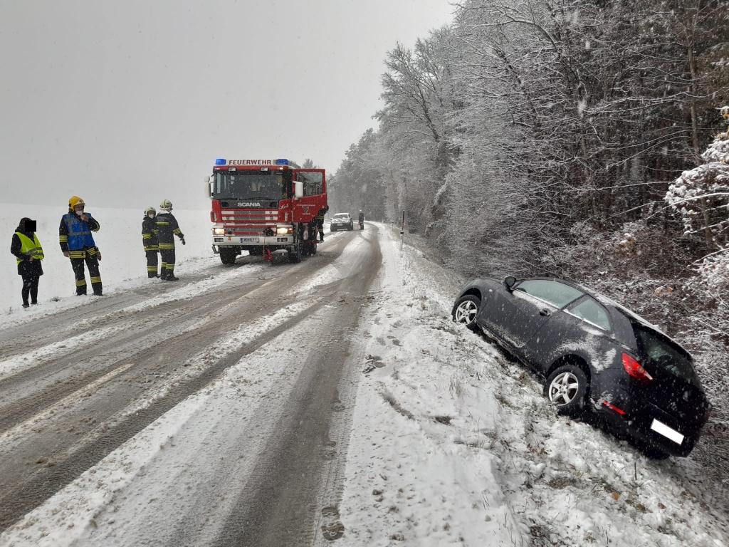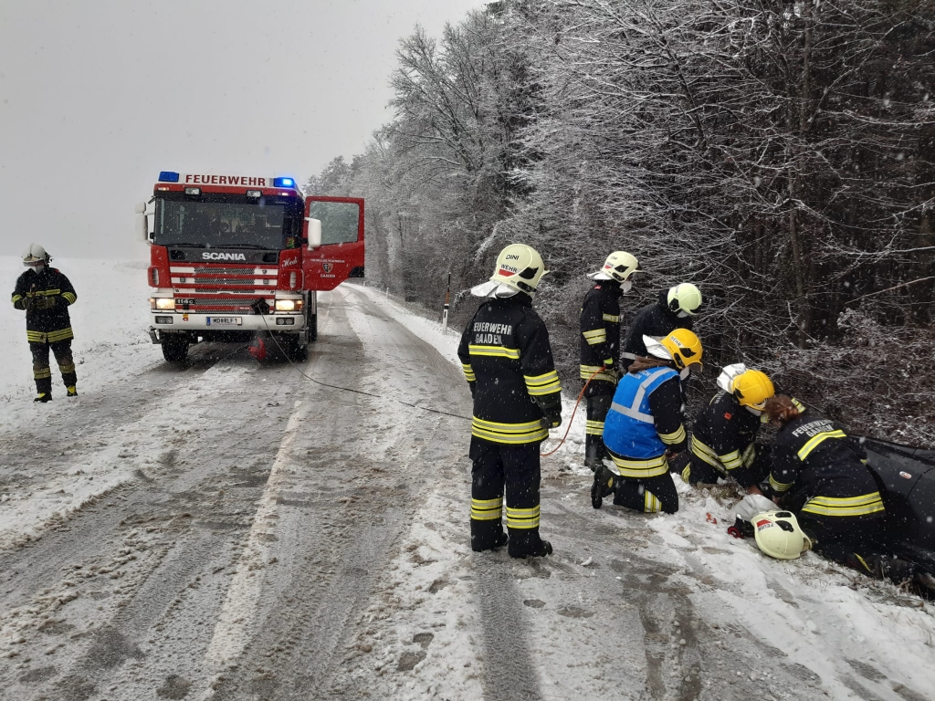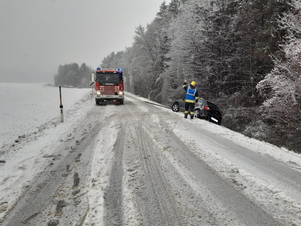 Am 26. November 2021 wurden wir um 12:35 Uhr zu einer Fahrzeugbergung auf die L4010 auf Höhe der S-Kurve alarmiert. Eine Lenkerin verlor auf der schneebedeckten Fahrbahn die Kontrolle über ihr Fahrzeuge und rutschte in weiterer Folge in den Straßengraben. Bei unserer Ankunft sicherten wir die Unfallstelle ab und bargen anschließend den PKW mittels Seilwinde aus dem Graben. Das Fahrzeug wurde auf die Abschleppbrille verladen und anschließend auf dem Parkplatz bei der Ortseinfahrt abgestellt. Acht Feuerwehrmitglieder waren eine Stunde lang im Einsatz.