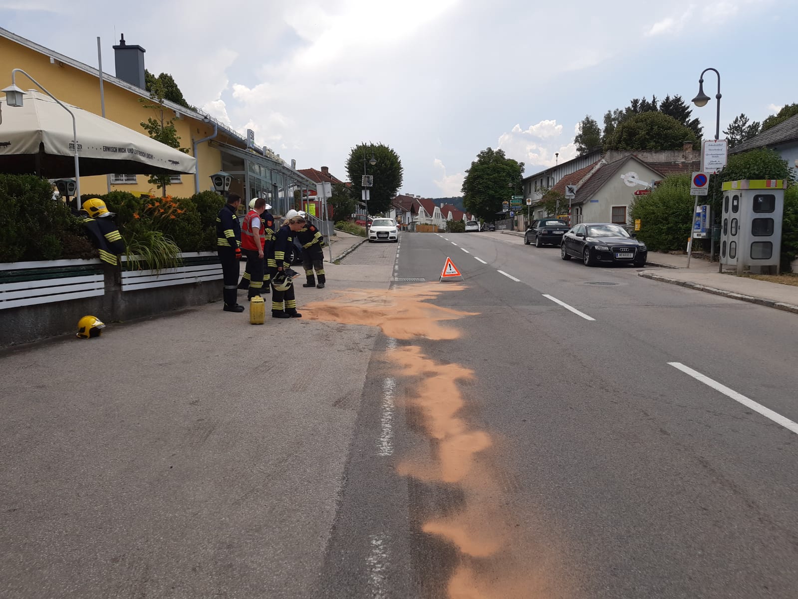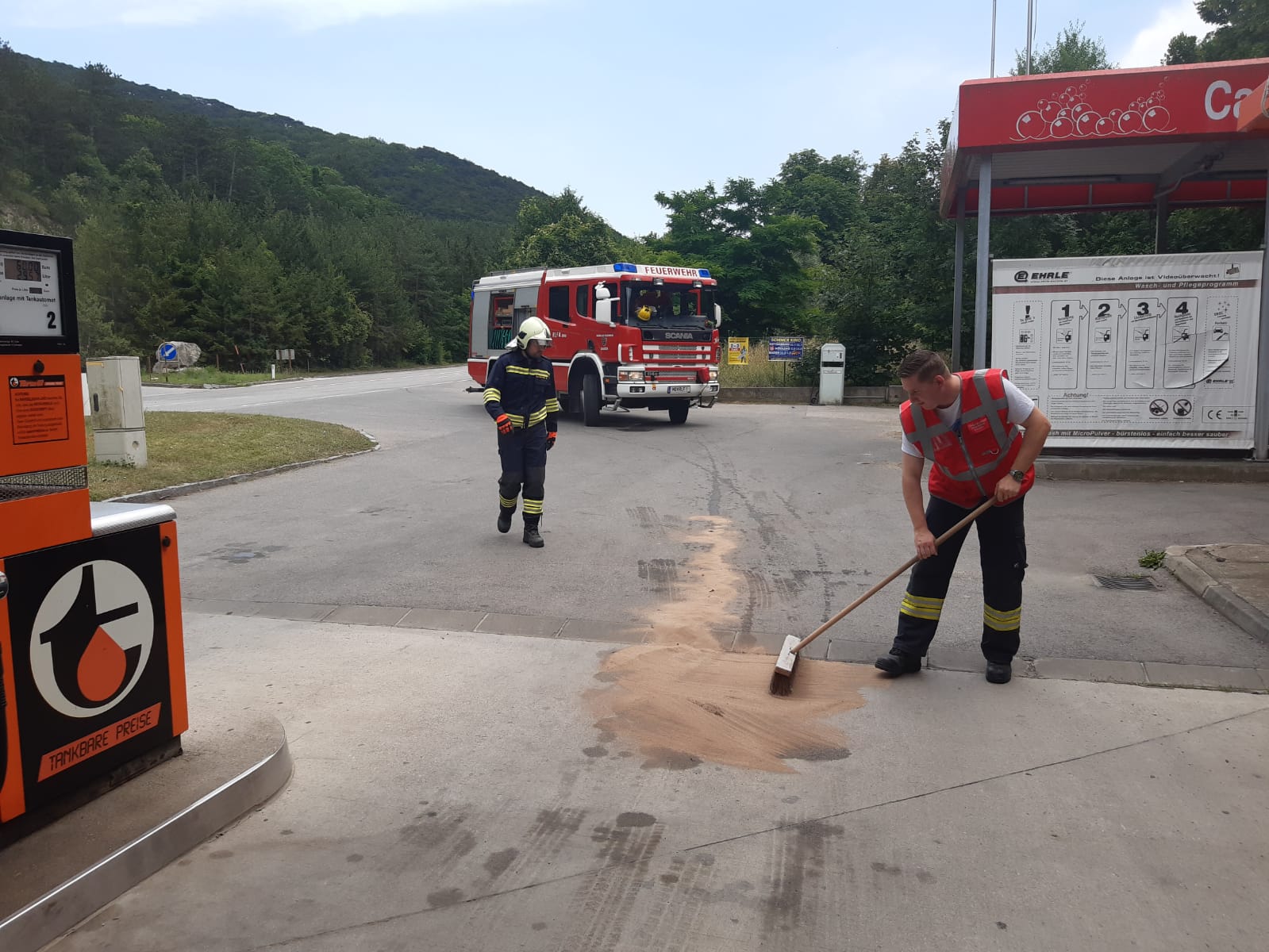 Am 1. Juli 2022 wurden wir um 14:31 Uhr zu einer Ölspur auf die Hauptstraße alarmiert. Auf einem Parkstreifen hatte ein PKW aus unbekannter Ursache Diesel verloren, welchen wir mit Ölbindemittel weitgehend entfernten. Da von der Einsatzörtlichkeit eine Dieselspur bis zur Tankstelle führte, kontrollierten wir vorsichtshalber auch diesen Bereich, wobei wir zwei weitere Dieselflecken vorfanden und mit Bindemittel behandelten. Nach einer Stunde konnten acht Feuerwehrmitglieder ihren Einsatz beenden.