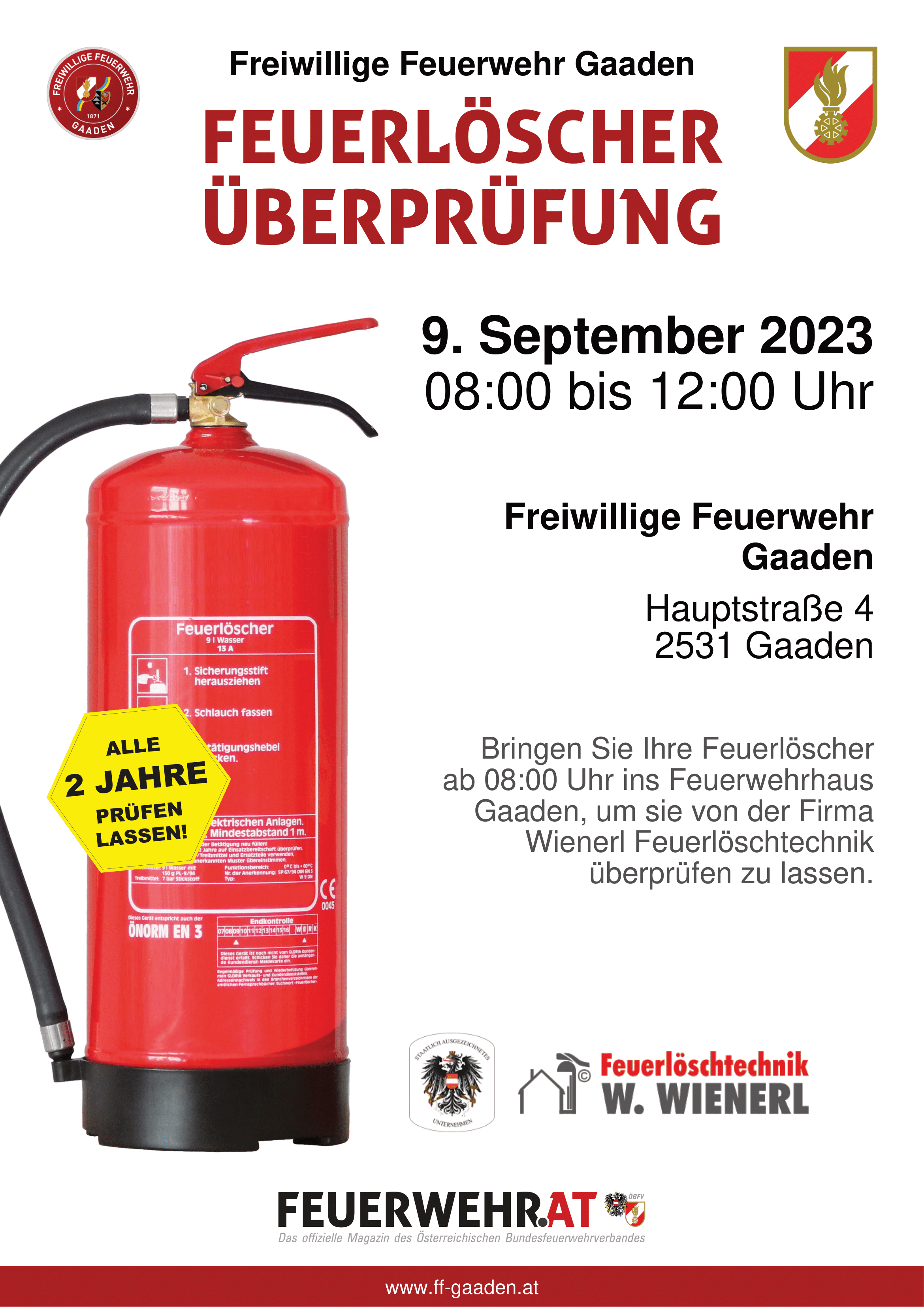 Wir bieten auch heuer wieder die Möglichkeit der Feuerlöscherüberprüfung durch die Firma Wienerl Feuerlöschtechnik an. Nutzen Sie diese Gelegenheit und bringen Sie Ihre Löscher am Samstag, den 9. September 2023 (Tag des Dorffestes), ab 08:00 Uhr ins Feuerwehrhaus Gaaden!