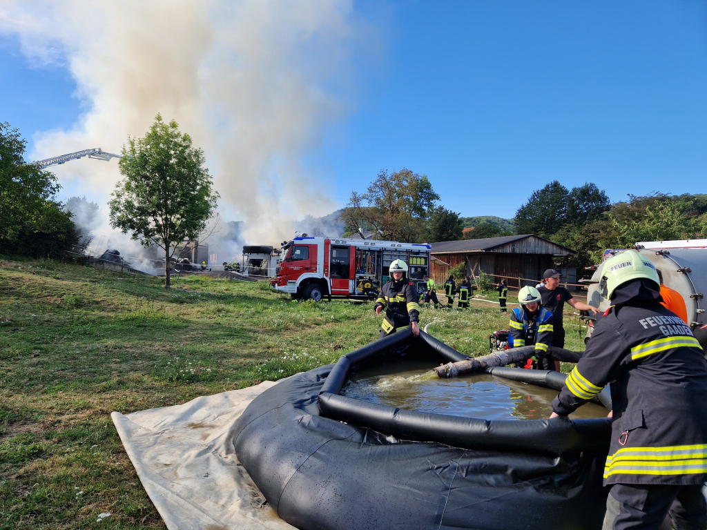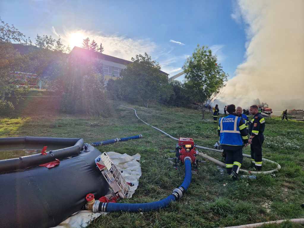 Unsere Aufgabe bestand an erster Stelle darin, den unmittelbaren Löschangriff unter Vornahme mehrerer Rohre zu unterstützen sowie ein Übergreifen der Flammen auf das angeschlossene Wohnhaus sowie die benachbarte Volksschule zu verhindern. Dies konnte aufgrund der starken Rauchentwicklung teilweise nur unter schwerem Atemschutz erfolgen. Da im weiteren Verlauf des Einsatzes das örtliche Hydrantennetz nicht mehr genügend Löschwasser zu Verfügung stellen konnte, wurden wir von der Einsatzleitung angewiesen, einen Pendelvekehr mit unseren Tanklöschfahrzeugen zu errichten, um ausreichend Wasser von Gaaden nach Sittendorf zu transportieren. Dabei wurden die Feuerwehren auch von lokalen Bauern tatkräftig unterstützt, welche mit Traktoren und Gülleanhängern immer wieder Löschwasser zur Einsatzstelle verbrachten. Um dieses sinnvoll nutzen zu können, errichteten wir unseren 10.000 Liter fassenden Falttank nahe der Einsatzstelle, welcher in weiterer Folge als Reservoir diente und eine ständige Versorgung der Angriffsrohre sicherstellte.