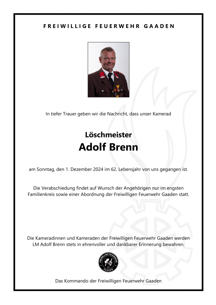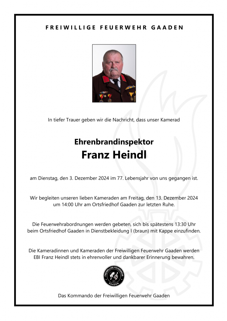 In tiefer Trauer geben wir die Nachricht, dass unsere Kameraden Adolf Brenn am 1. Dezember 2024 im 62. Lebensjahr nach mutig getragener Krankheit und Ehrenbrandinspektor Franz Heindl am Dienstag, den 3. Dezember 2024 im 77. Lebensjahr plötzlich und unerwartet von uns gegangen sind. Wir werden unsere lieben Kameraden stets in ehrenvoller und dankbarer Erinnerung bewahren.