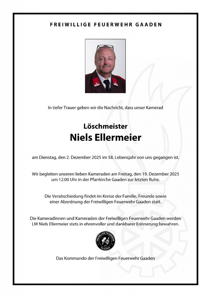 Wir begleiten unseren lieben Kameraden am Freitag, den 19. Dezember 2025 um 12:00 Uhr in der Pfarrkirche Gaaden zur letzten Ruhe. Die Verabschiedung findet im Kreise der Familie, Freunde sowie einer Abordung der Freiwilligen Feuerwehr Gaaden statt.