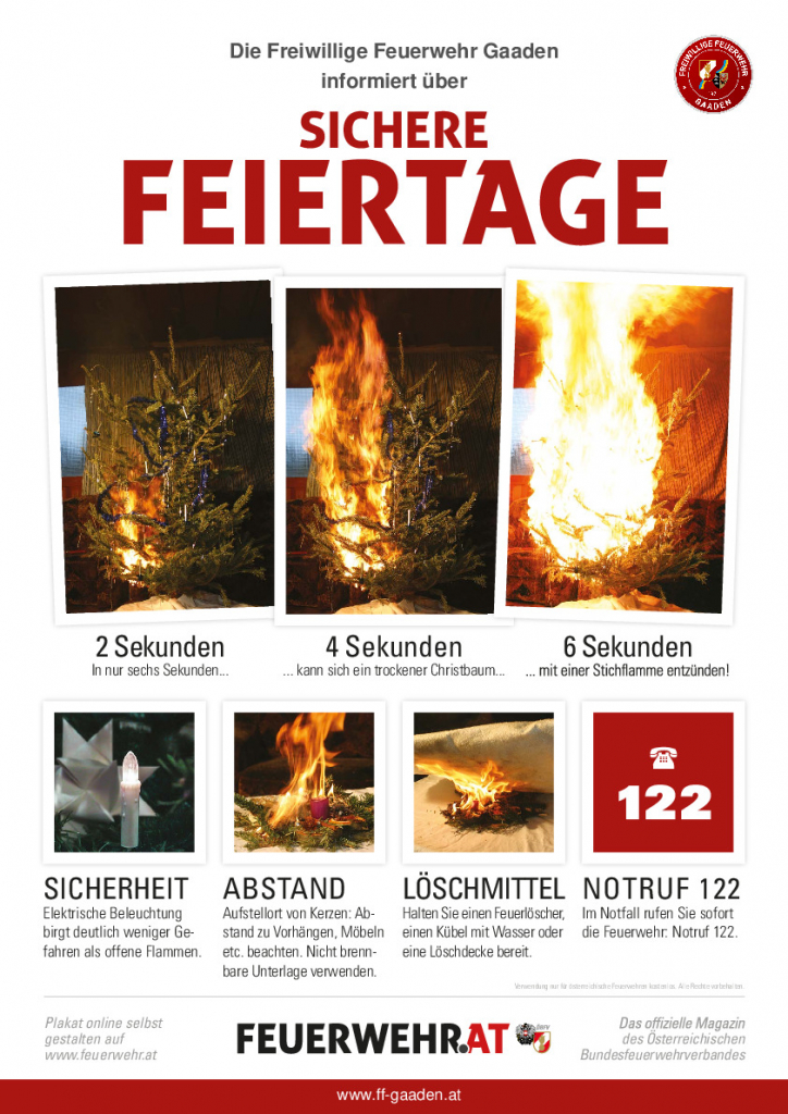 Damit es in der Weihnachtszeit sowie am Heiligen Abend nicht zu unerwünschten Überraschungen kommt, beachten Sie bitte unsere Sicherheitstipps über den Umgang mit offenem Feuer am Adventkranz oder Christbaum. Im Falle eines Brandes – sei dieser erst in der Entstehung oder schon vermeintlich abgelöscht – wählen Sie bitte unverzüglich den Feuerwehrnotruf 122!