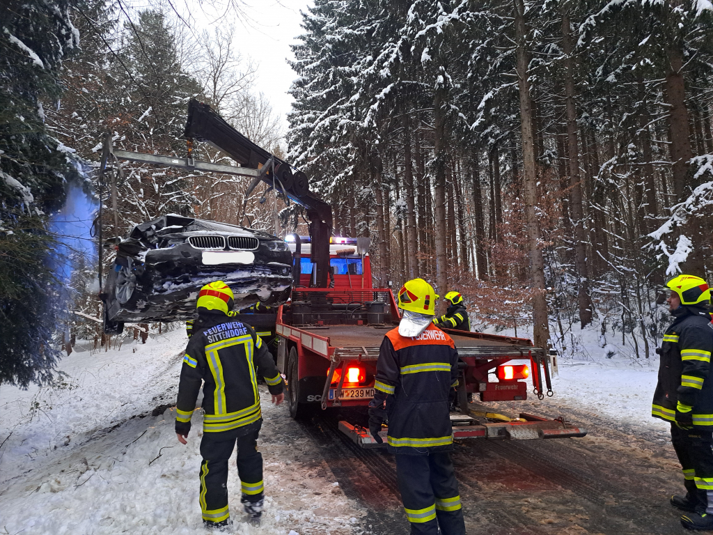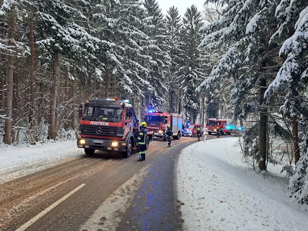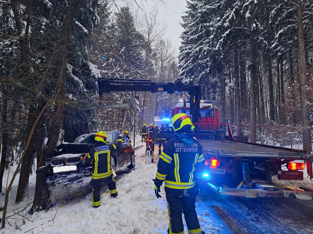 Um 18:45 Uhr wurden wir gemeinsam mit der Freiwilligen Feuerwehr Sittendorf zum zweiten Einsatz des Tages alarmiert. Einsatzstichwort war ein Verkehrsunfall „mit unklarer Lage – eine Person im Fahrzeug“. Unmittelbar nach unserem Eintreffen wurde die Lage erkundet, wobei sich herausstellte, dass keine Person im Fahrzeug eingeklemmt war. Ein Fahrzeuglenker kam auf der schneeglatten L128 zwischen Sittendorf und der Autobahnanschlussstelle Heiligenkreuz mit seinem PKW von der Fahrbahn ab und prallte gegen einen im Straßengraben befindlichen Baum. Durch die Wucht des Aufpralls wurden die Airbags ausgelöst, die Beifahrerin erlitt dabei Verletzungen unbestimmten Grades. Nach der Erstversorgung der Verletzten durch den Rettungsdienst und der Unfallaufnahme durch die Polizei erfolgte die Fahrzeugbergung mittels Ladekran des LAST Sittendorf. Die Freiwillige Feuerwehr Gaaden stand mit zwei Fahrzeugen und zehn Mitgliedern etwas mehr als eine Stunde im Einsatz.