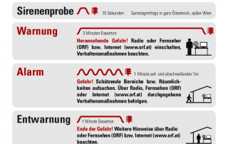 Jeden ersten Samstag im Oktober findet in ganz Österreich der jährliche Zivilschutz-Probealarm statt, um die Bevölkerung über die verschiedenen Sirenensignale zu informieren und die Warneinrichtungen auf ihre Funktionstüchtigkeit zu überprüfen. Im Falle eines Zivilschutzalarmes gibt es drei wichtige Sirenensignale, über die wir Sie in der folgenden Grafik informieren möchten.